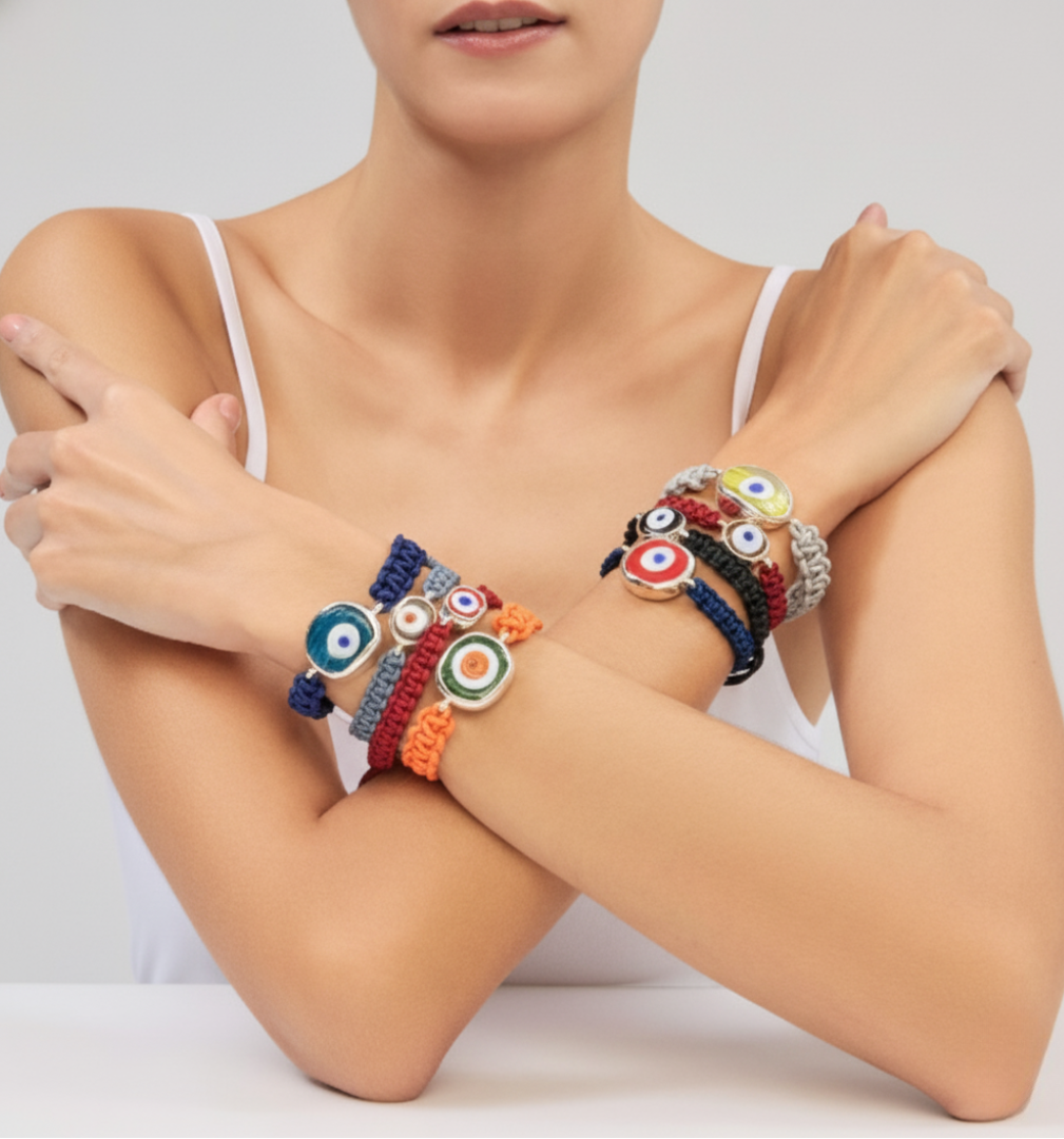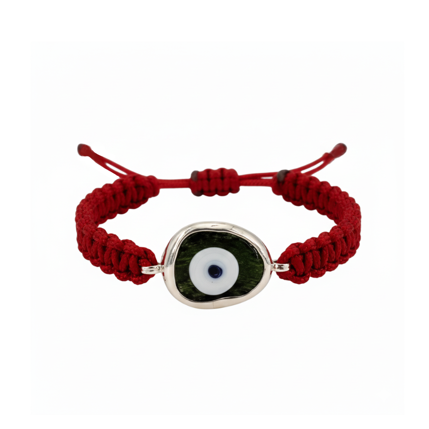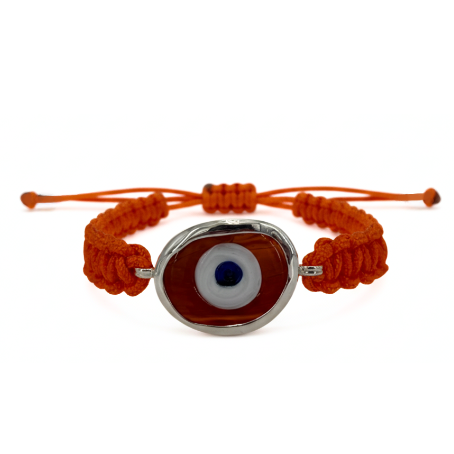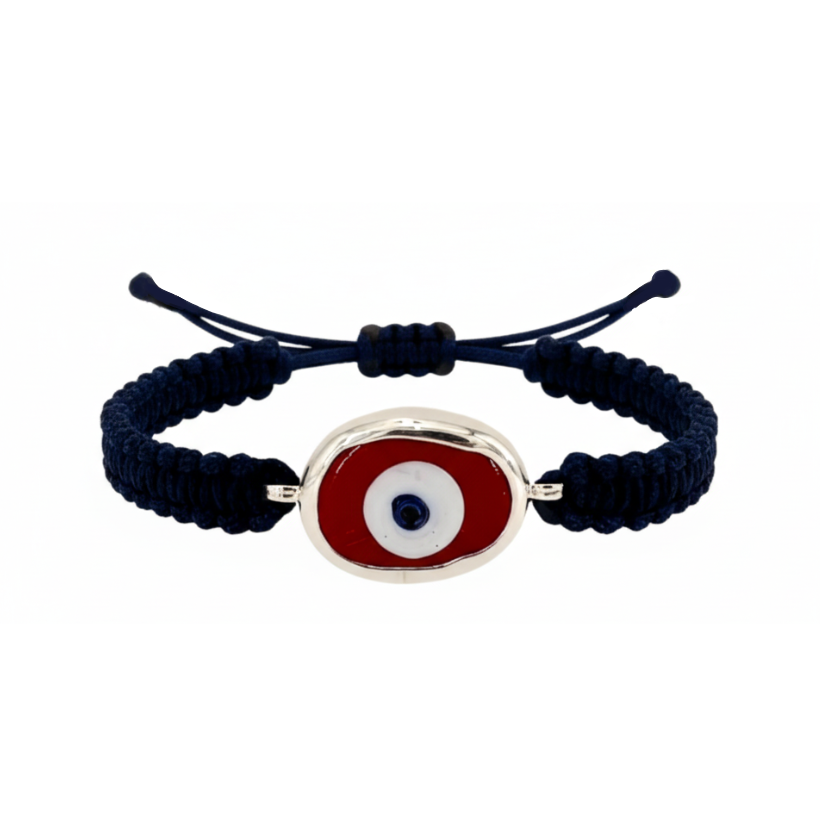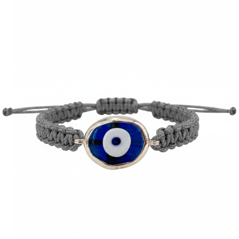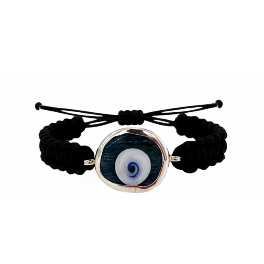 A modern expression of an ancient symbol — the “evil eye” has been cherished in Greek culture for over 3,000 years as a talisman of luck and protection. This bracelet features a hand-blown glass eye, symbolizing tranquility, protection, and clarity, set in sterling silver and woven onto a colorful cord for a touch of joyful contrast.
