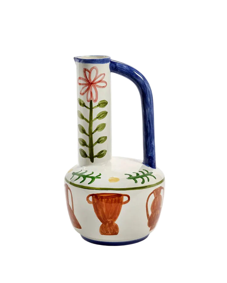 This hand-painted ceramic vase reflects Shirley Villavicencio Pizango’s artistic energy and vibrant sense of color. The tall shape and expressive details echo the warmth and spontaneity of her work, turning a functional object into a piece of art.