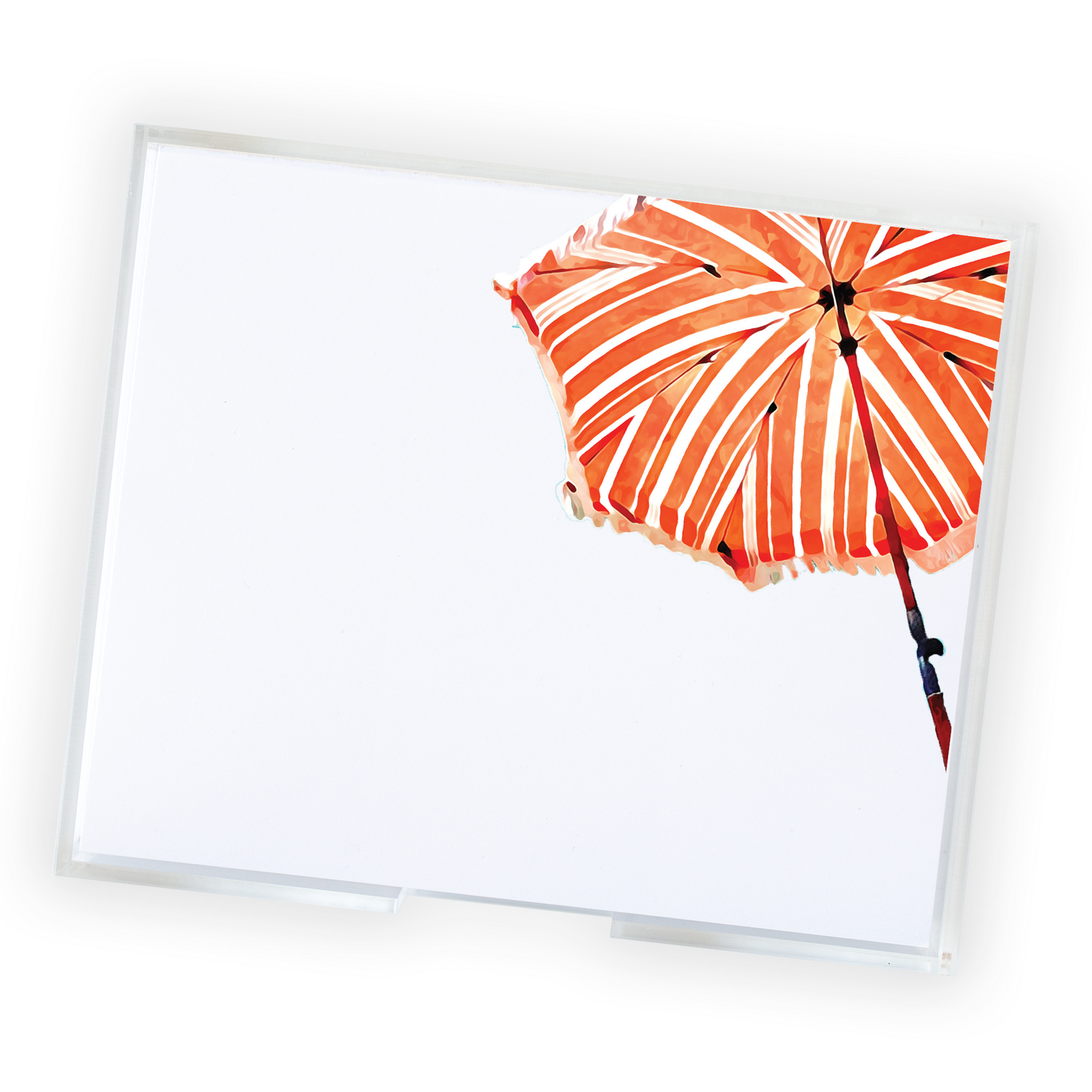Our 8.5 x 7-inch Coral Umbrella notepad boasts 275 sheets of luxurious quality paper and makes the perfect birthday or hostess gift inspired by the most relaxing of summer travels!It fits beautifully in our large acrylic tray (sold separately).