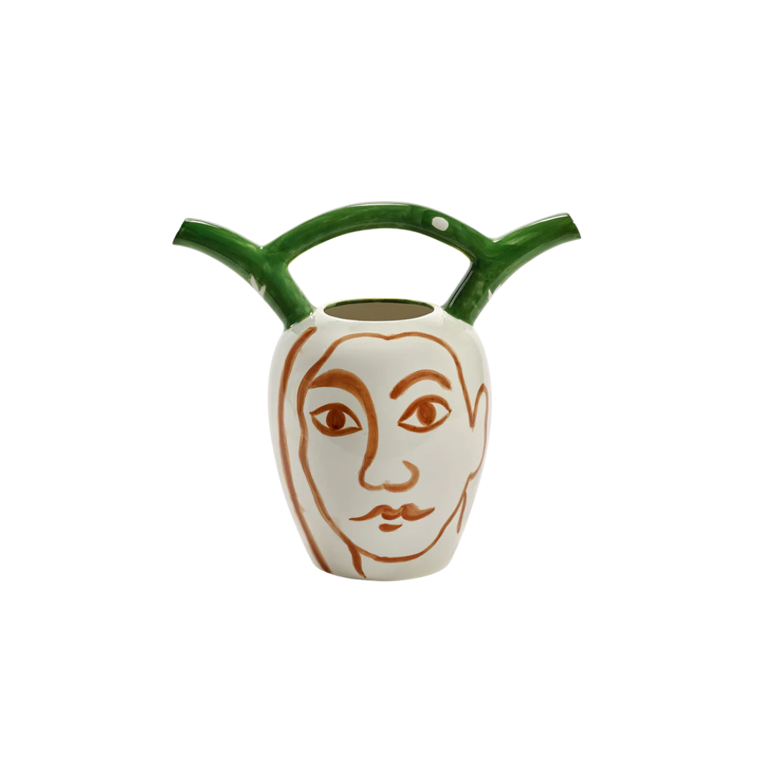 This hand-painted ceramic vase embodies the expressive world of Shirley Villavicencio Pizango. Its bold colors and organic lines recall the warmth of the Amazon and the spontaneity of her paintings. Each side tells a different story, turning the piece into a vibrant, ever-evolving centerpiece.