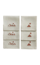 A set of six linen cocktail napkins, hand embroidered with pyramid motifs in a rich terracotta colour