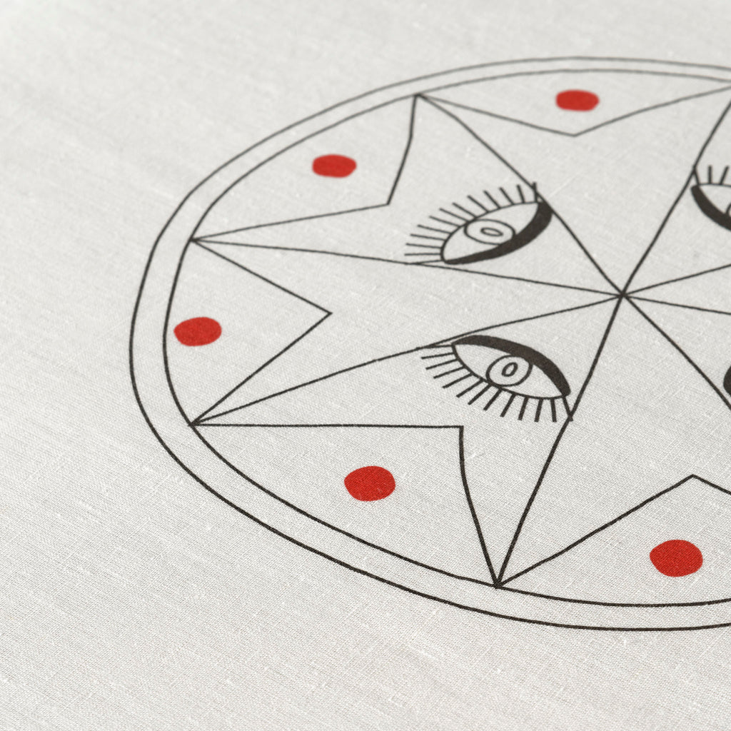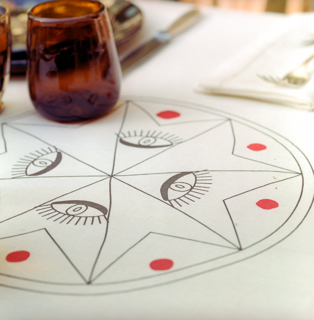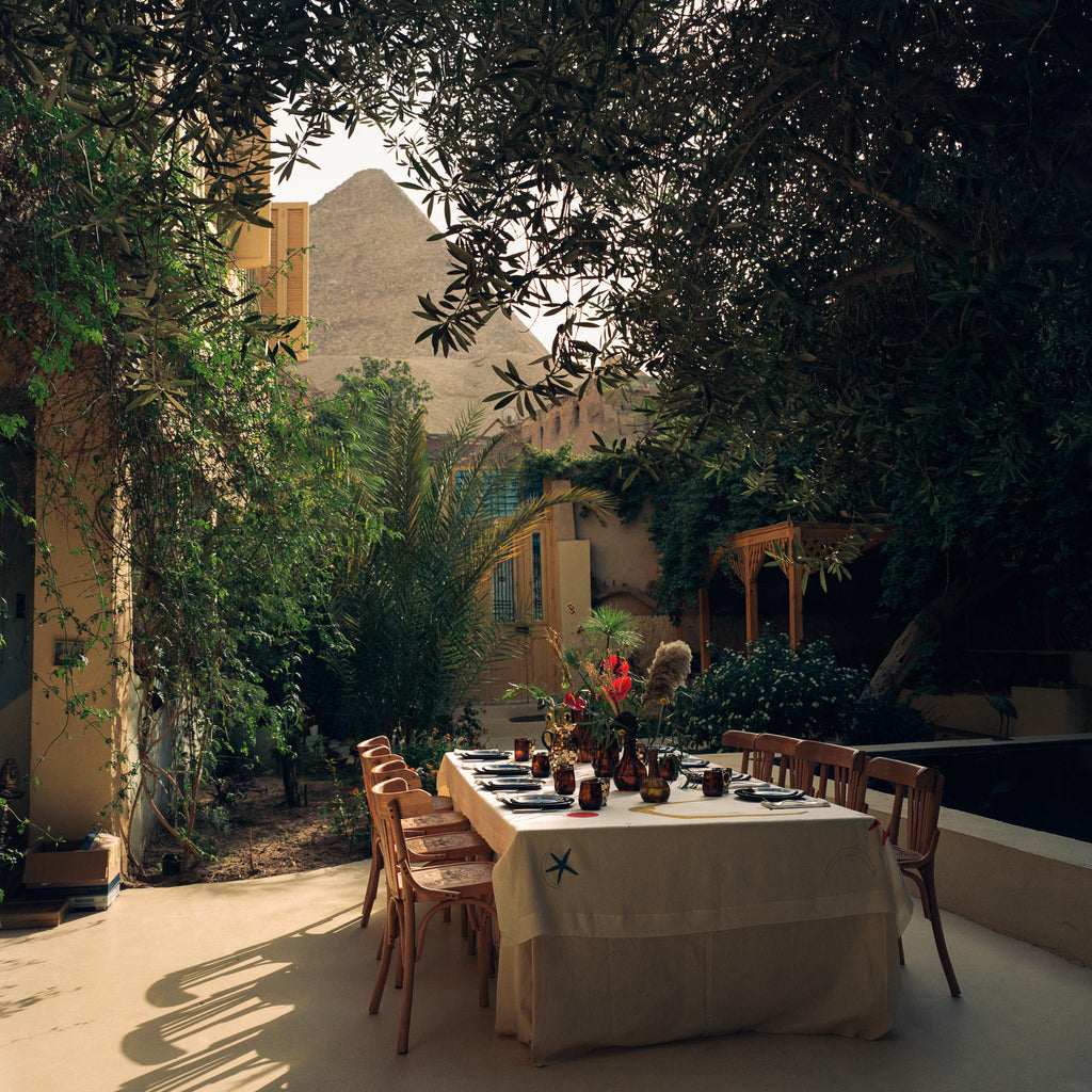 A surrealist dream takes shape across this linen tablecloth, hand-crafted in Cairo by skilled artisans at the Anūt Embroidery Training Centre (TOH). Planets, stars and the Goddess Nut, goddess of the sky and protector of the world, come together in an eclectic, fantastical mix, to make any alfresco feast feel joyful and spirited.