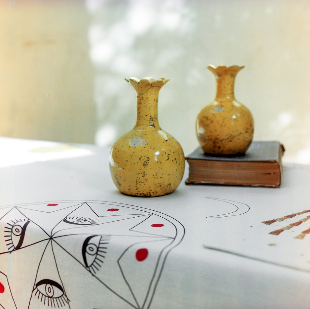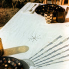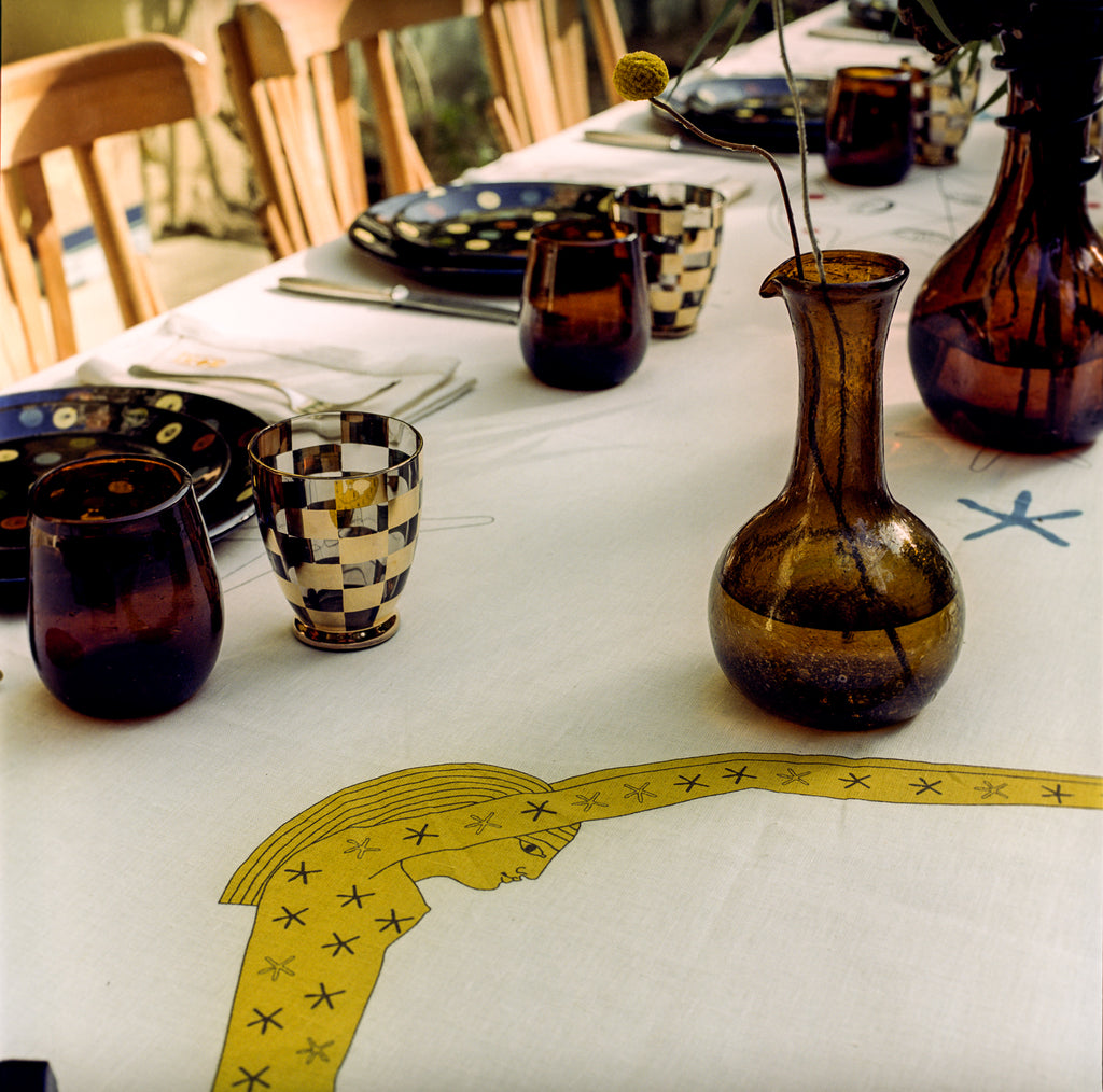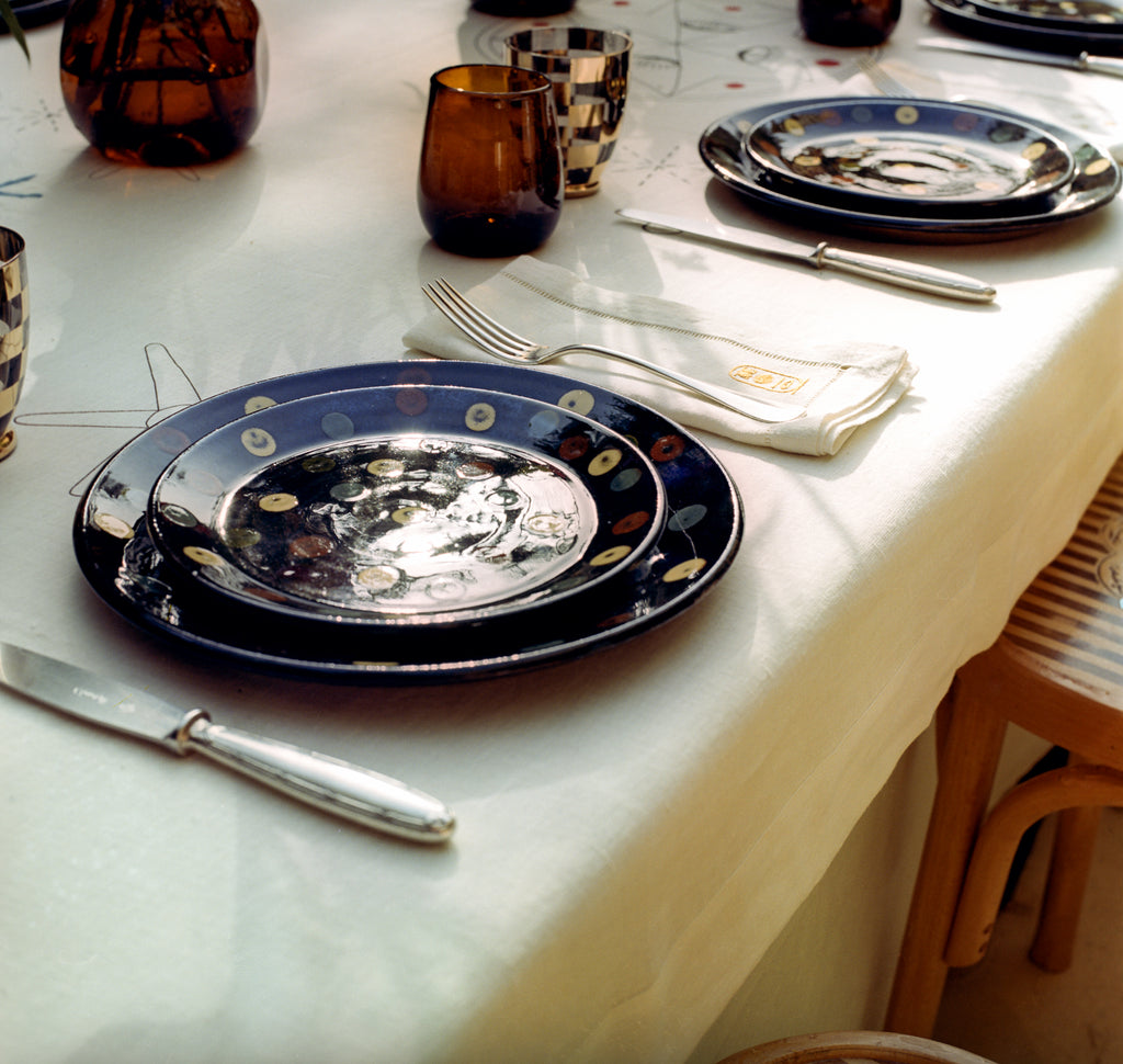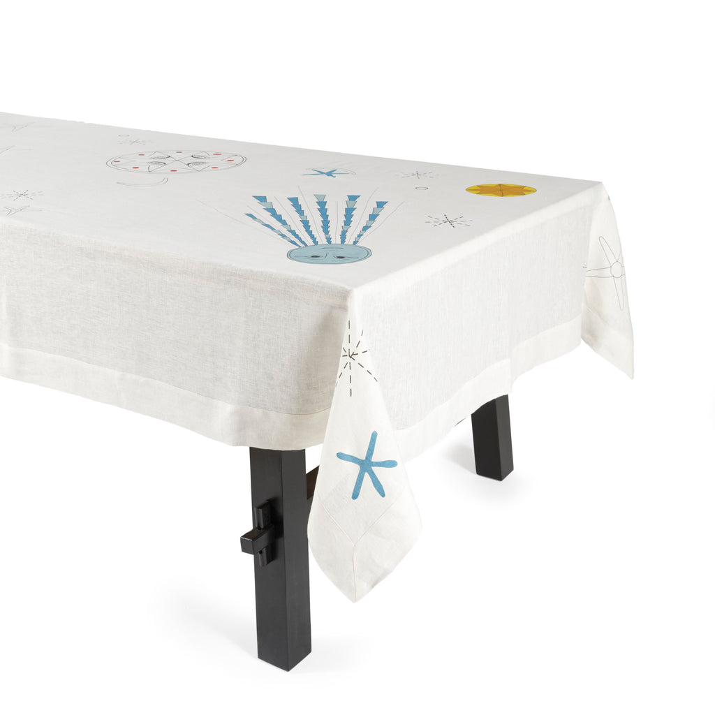 A surrealist dream takes shape across this linen tablecloth, hand-crafted in Cairo by skilled artisans at the Anūt Embroidery Training Centre (TOH). Planets, stars and the Goddess Nut, goddess of the sky and protector of the world, come together in an eclectic, fantastical mix, to make any alfresco feast feel joyful and spirited.