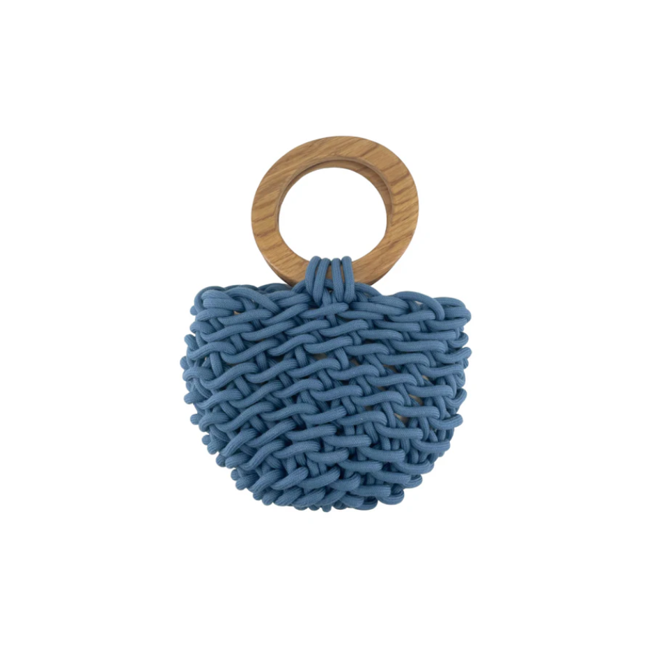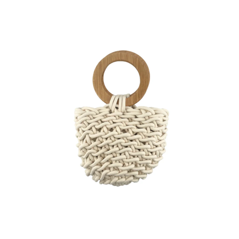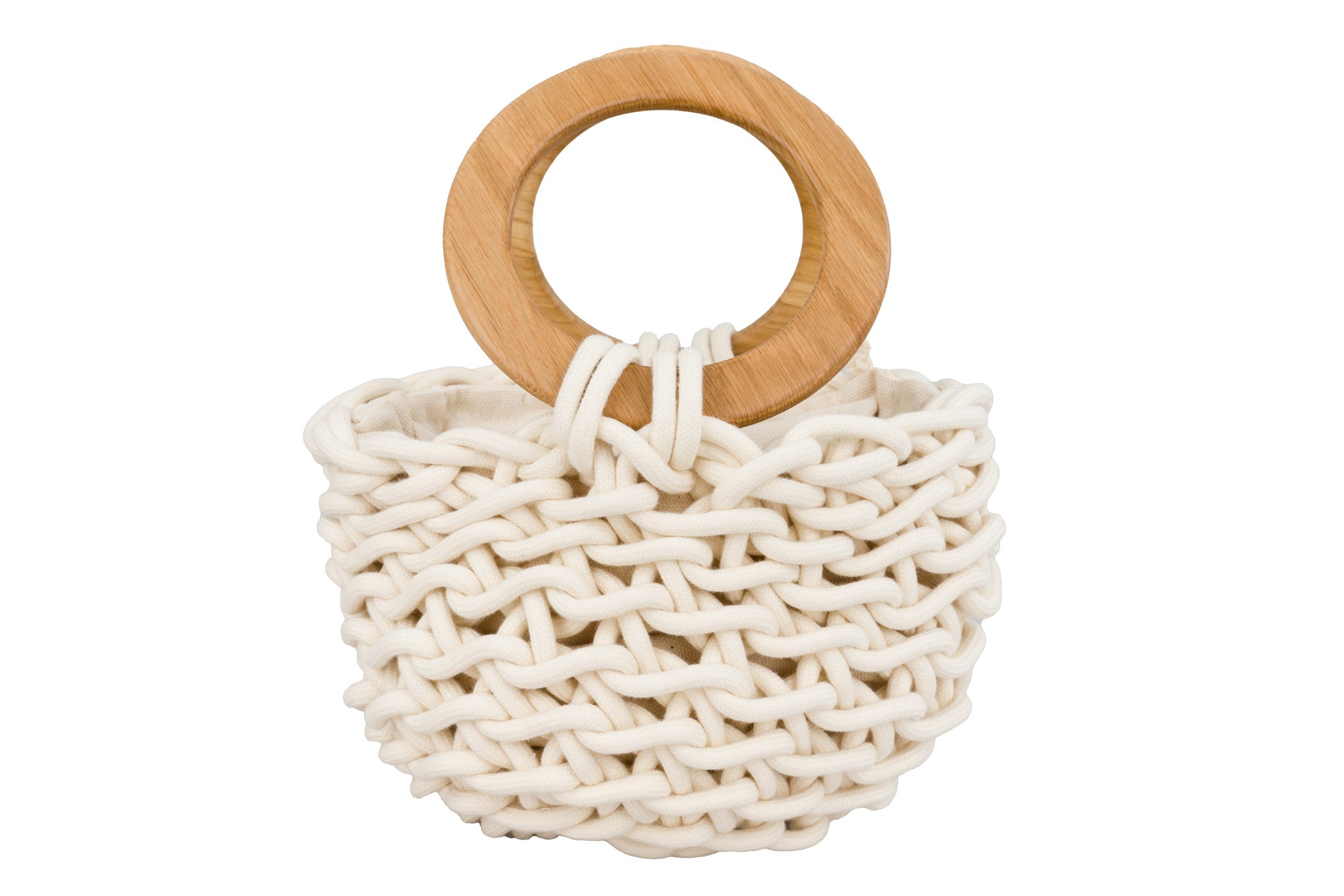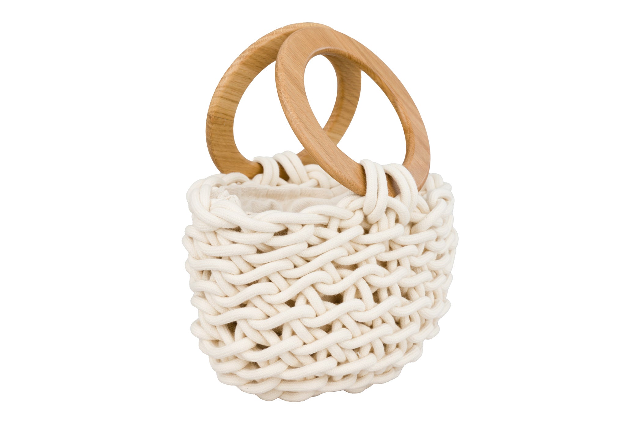 This sustainable handbag, handcrafted in Perugia, Italy from organic cotton ropes originally produced as cotton wicks for oil lamps. One-of-a-kind wooden handles. Each piece is handmade and thus unique.