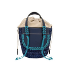 The Habanera Color Bloc Azucena bag has two leather handles and can be transformed into a crossbody. In this style the two ocean blue leather flaps and handles are decorated all around with waxed cords threading in blue tone, entirely handmade. The lining is made with beige linen color up-cycled fabric. All leather edges are hand painted and the basket is blue colored in tone. Inside a zip pocket. Hot stamped leather bottom.