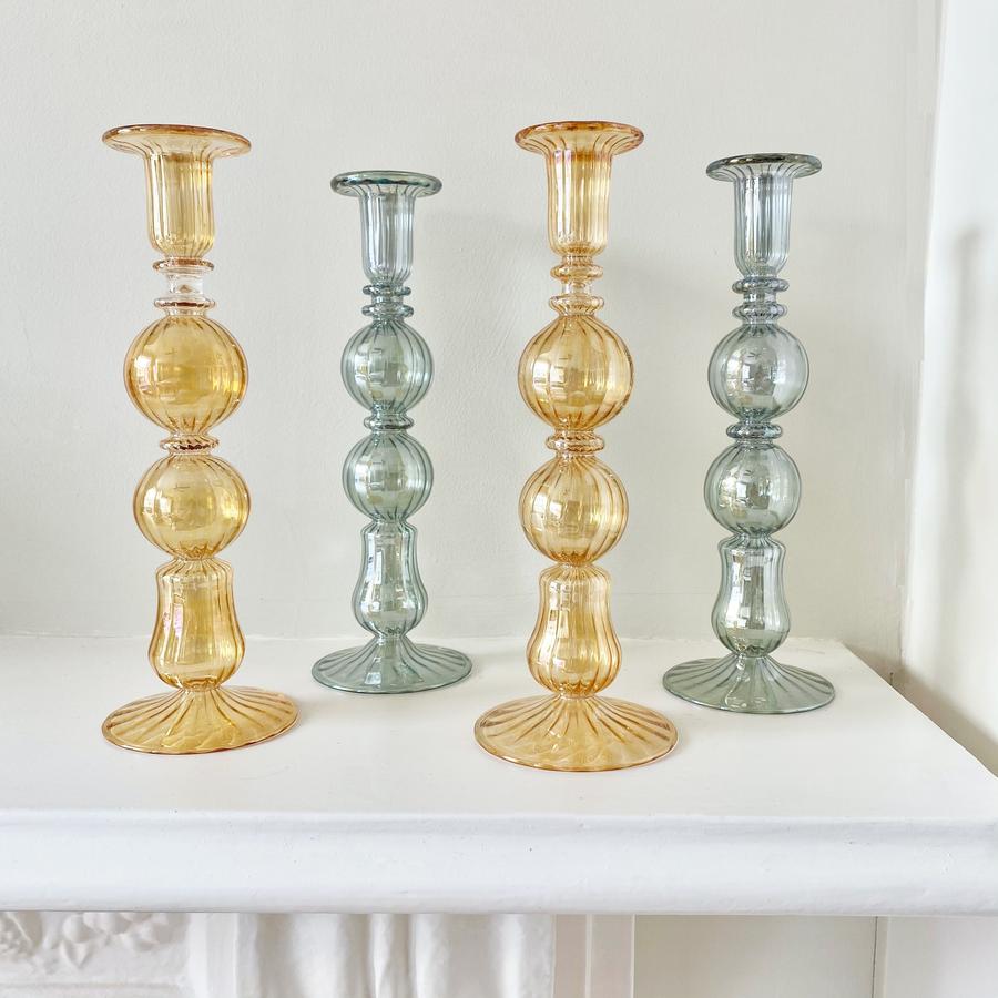 A beautiful handblown glass candle holder designed by Issy Granger and made by Egyptian artisans in Cairo. Egypt has a rich history of glassblowing dating back well over 3000 years, and the artisans today continue the craft that has been passed down through the generations. They are an eye-catching addition to a mantelpiece or dining table.