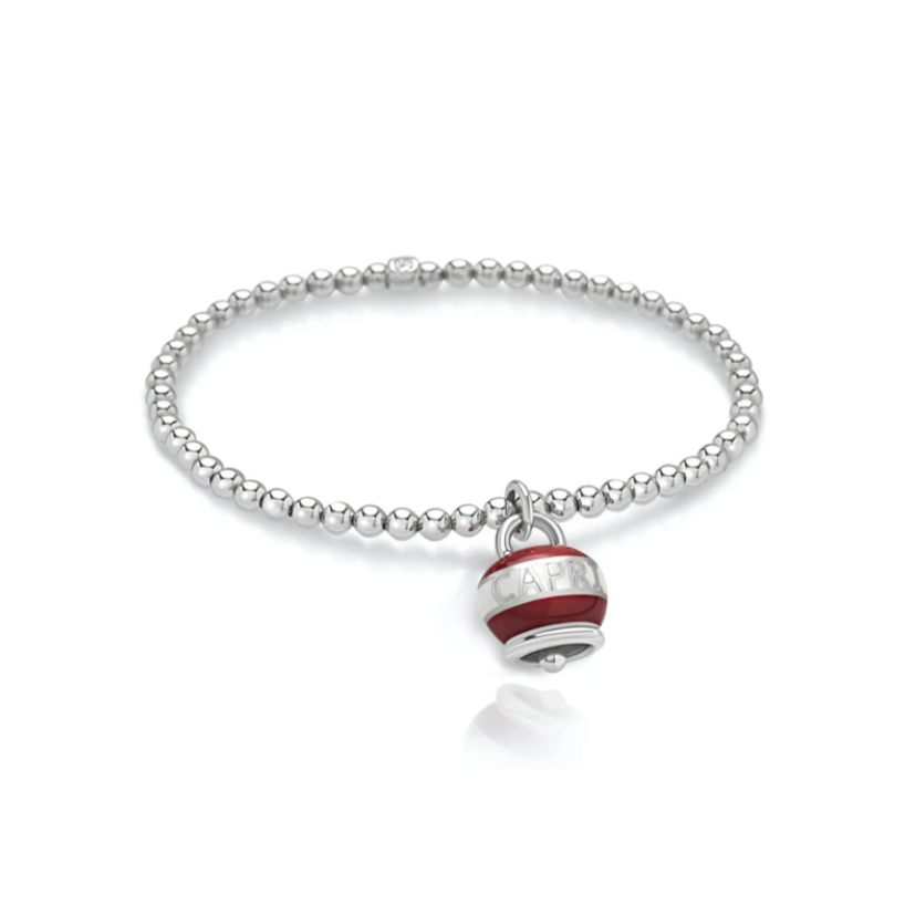 Et Voilà elastic bracelet with small Campanella Capriness Dolce Vita charm in silver and white and red enamel.