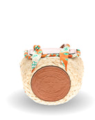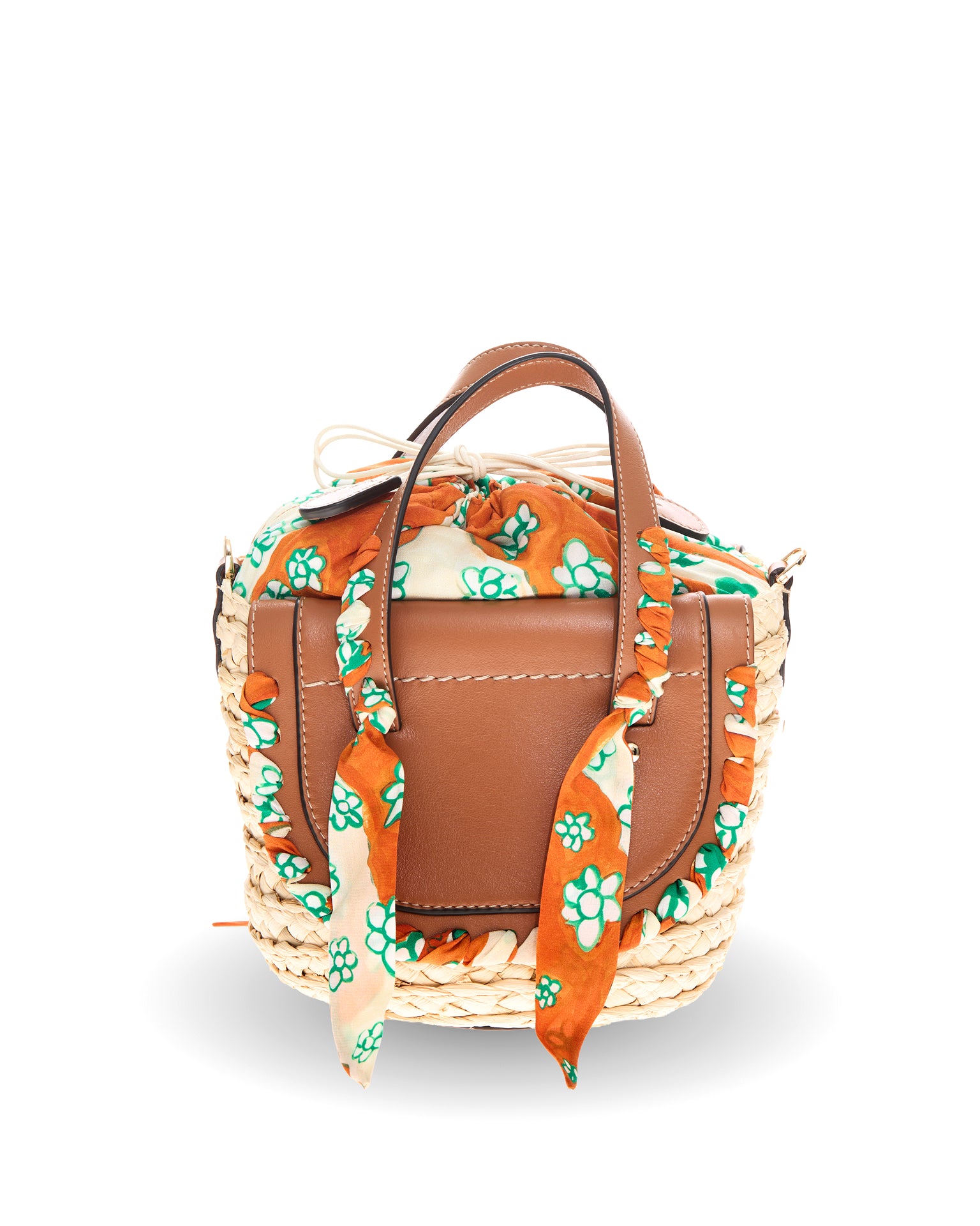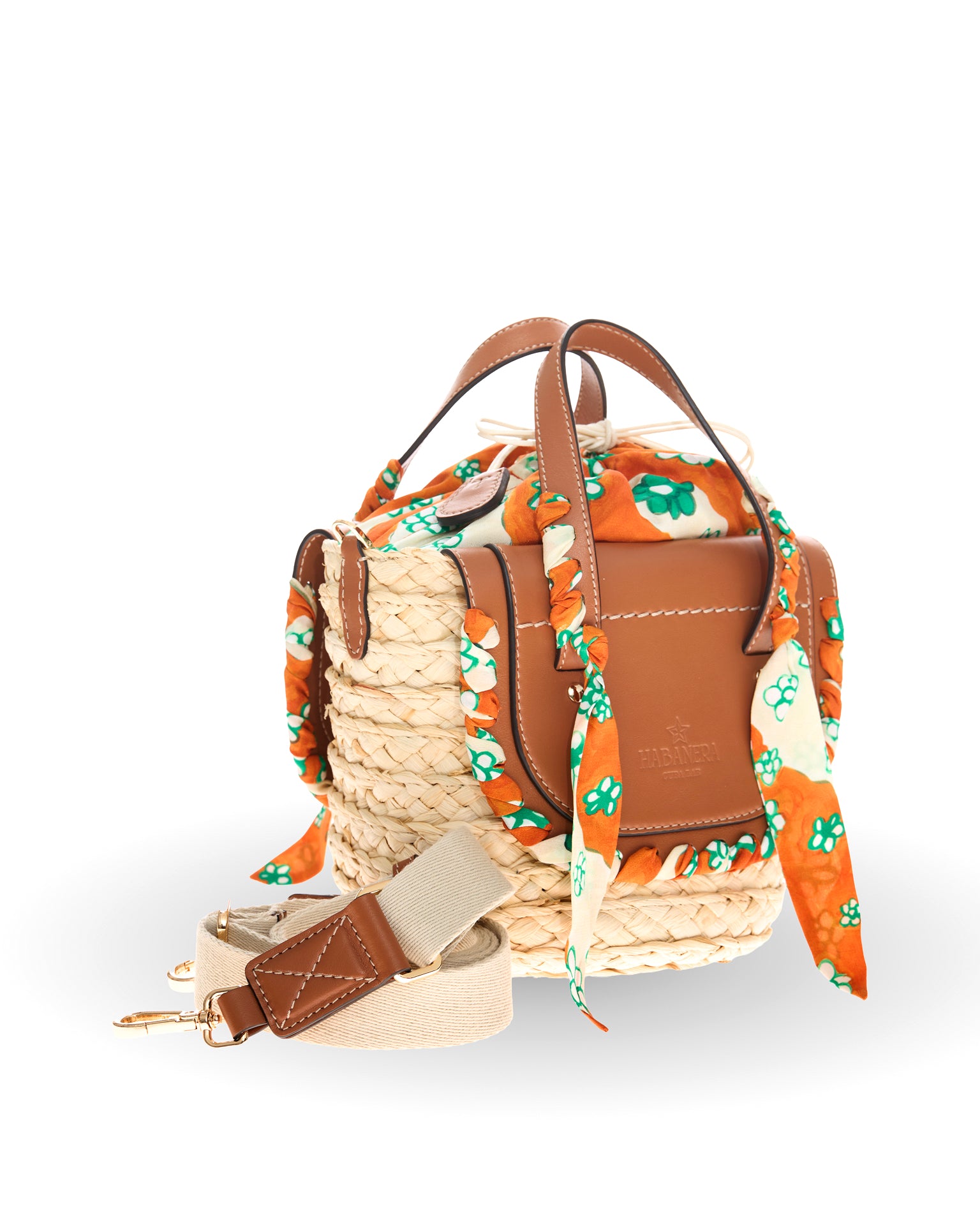 The Habanera Silk bag has two leather handles and can be transformed into a crossbody. In this style the two kenia brown leather flaps and handles are decorated with a upcycled pure silk tailoring handmade ribbon, in carrot and light green daisies flowers design, same of the lining. All leather edges are hand painted and the basket is in natural corn color. Inside a zip pocket. Hot stamped leather bottom