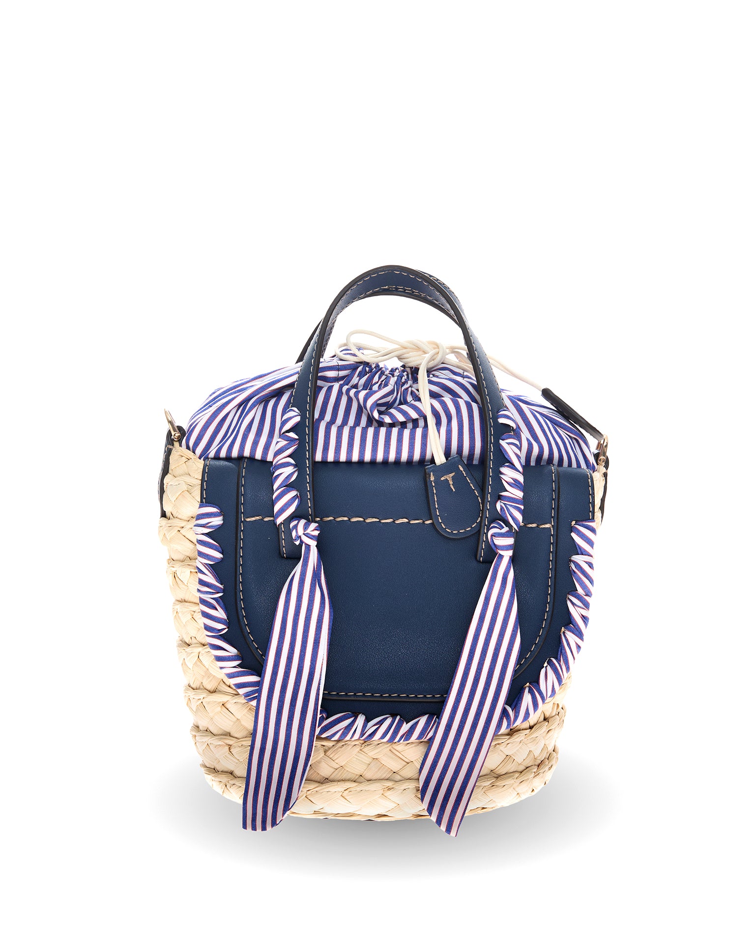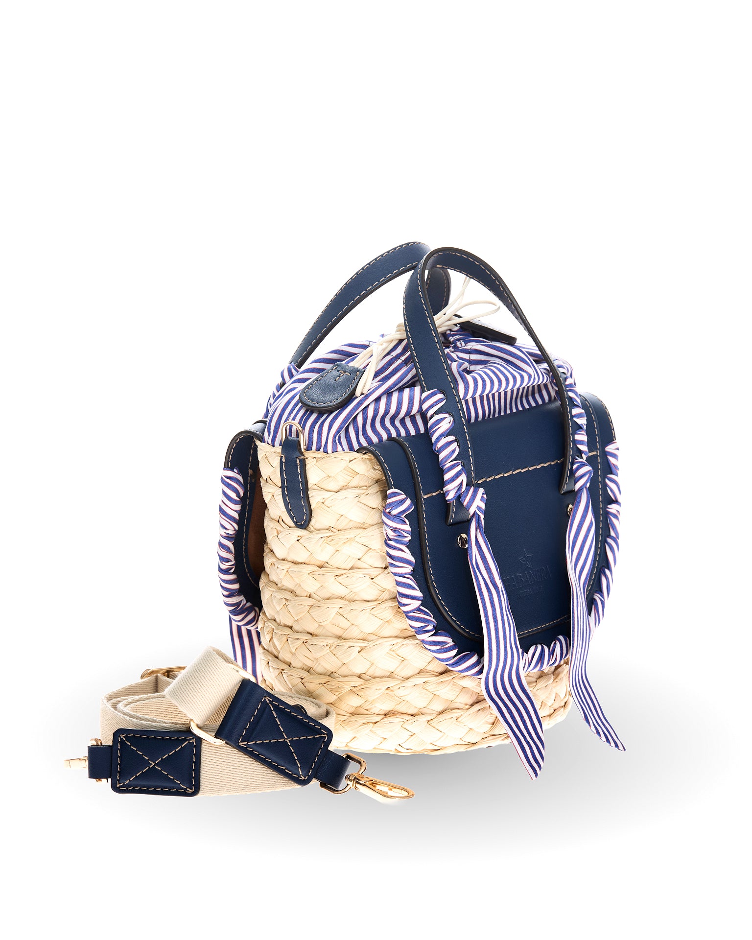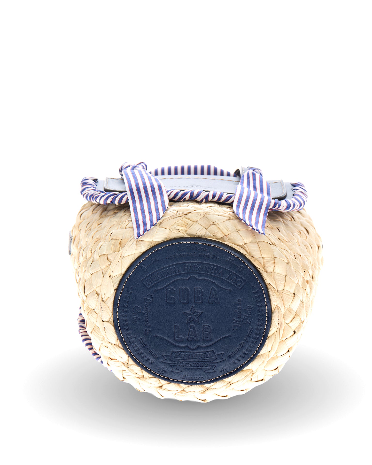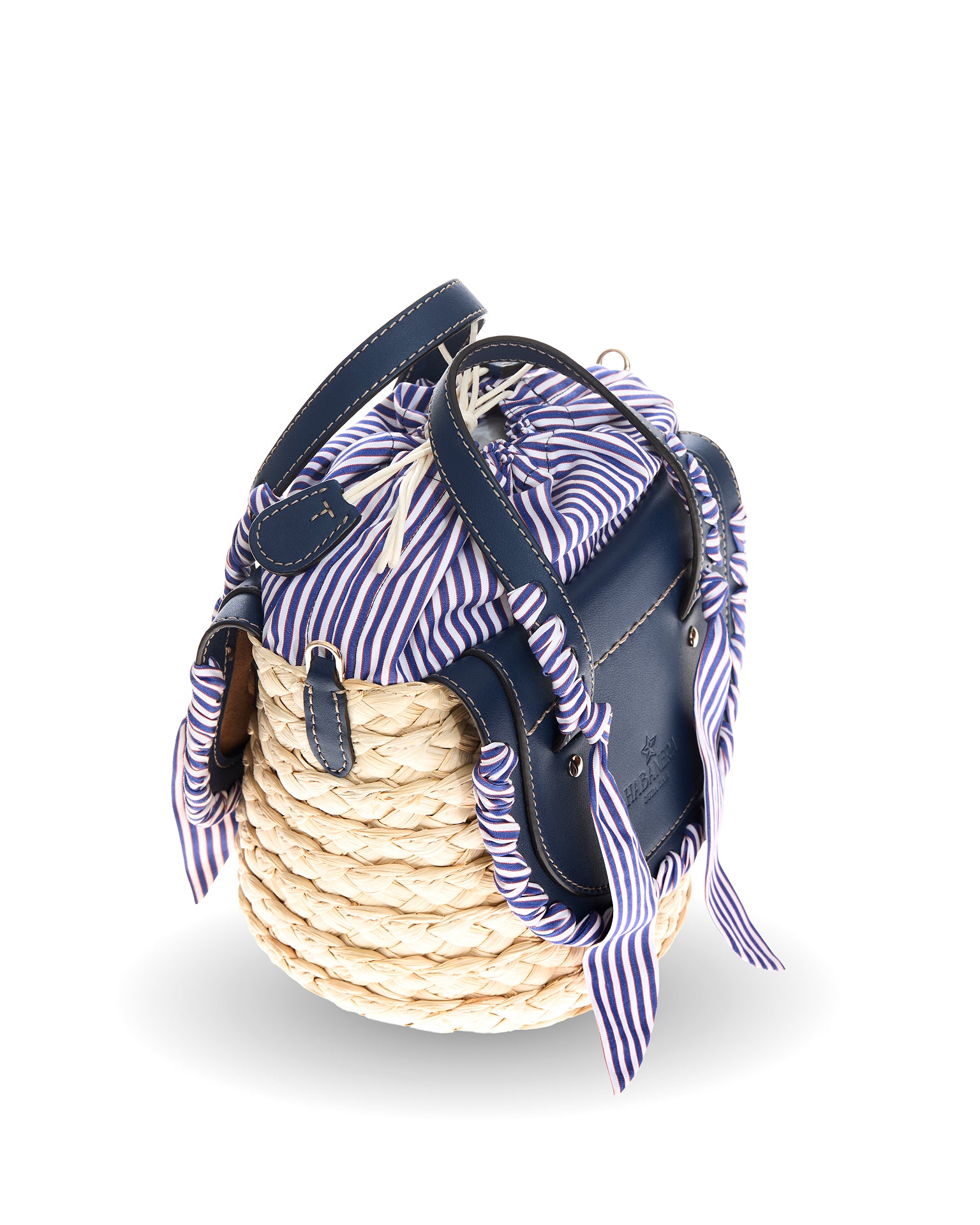 The Habanera Popeline bag has two leather handles and can be transformed into a crossbody. In this style the two dark blue leather flaps and handles are decorated with a upcycled extra fine popeline cotton fabric tailoring handmade ribbon, in ocean blue and white stripes color, same of the lining. Inside a zip pocket. All leather edges are hand painted and the basket is in natural corn color. Hot stamped leather bottom.