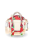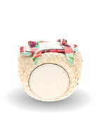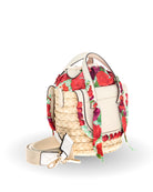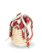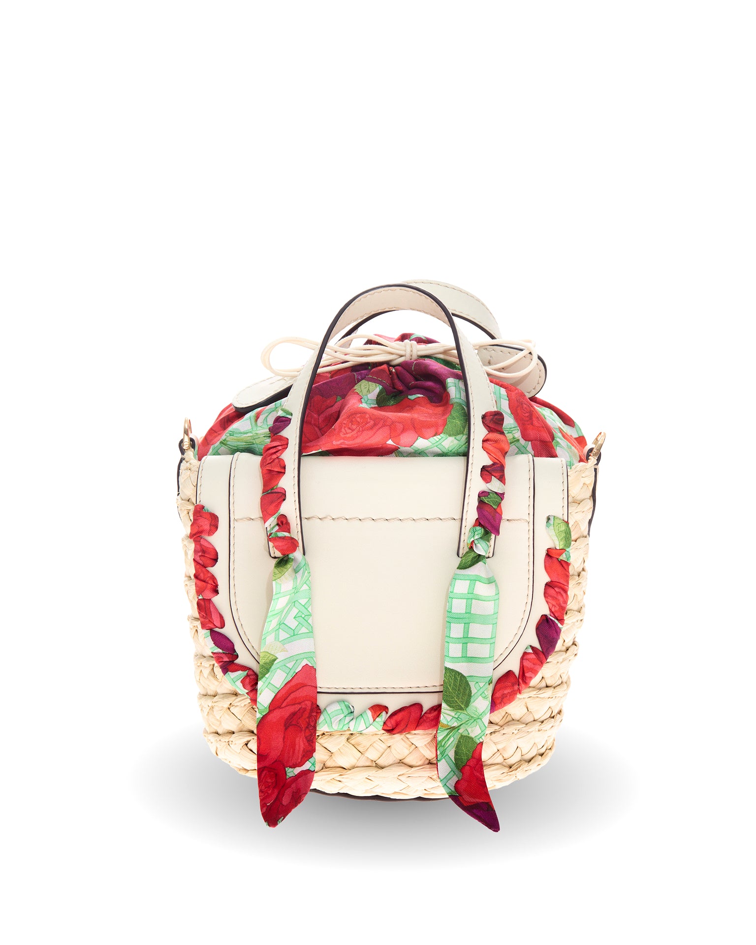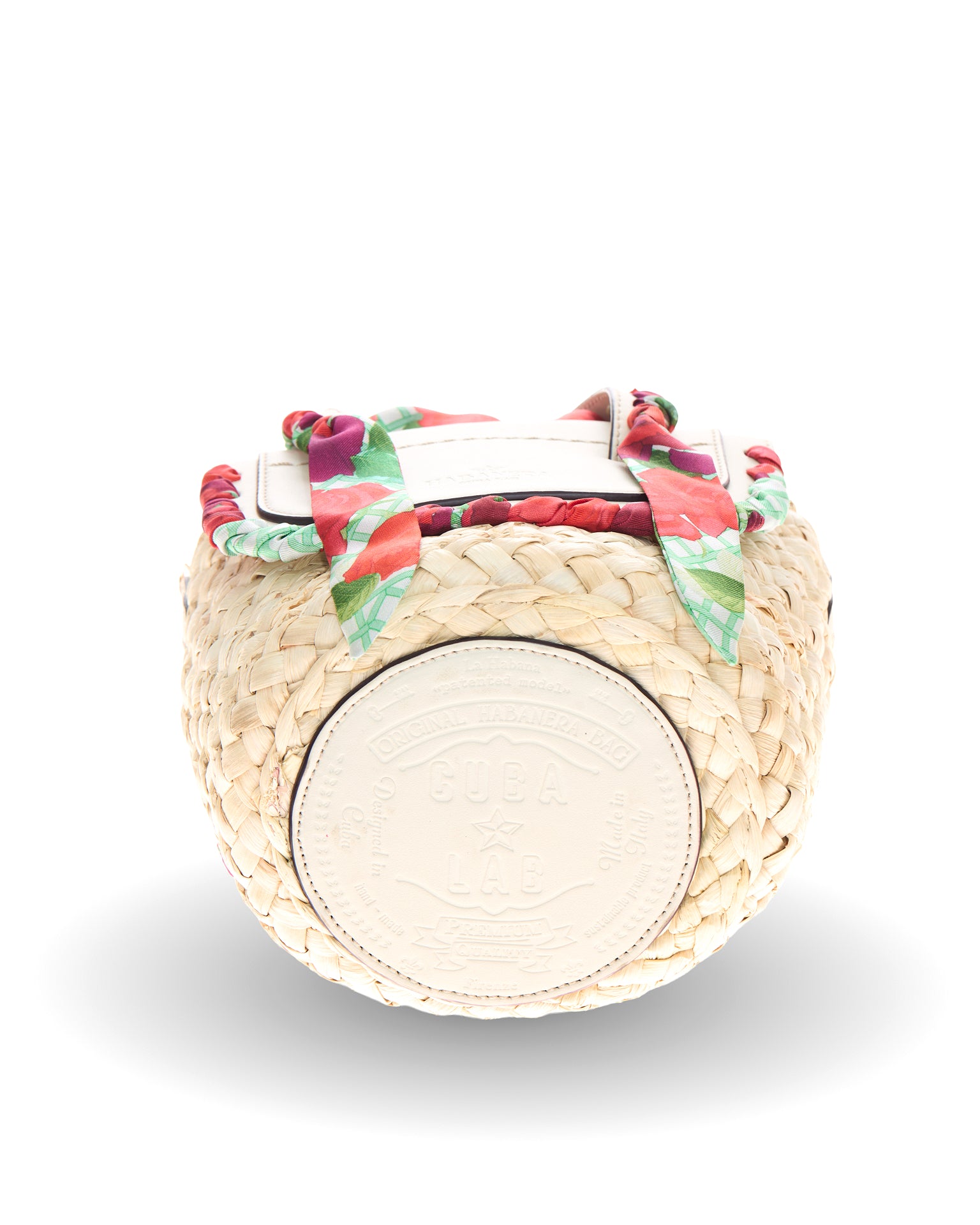 The Habanera Silk bag has two leather handles and can be transformed into a crossbody. In this style the two off-white leather flaps and handles are decorated with a upcycled pure silk tailoring handmade ribbon, in red and light green rose garden design, same of the lining. All leather edges are hand painted and the basket is in natural corn color. Inside a zip pocket.