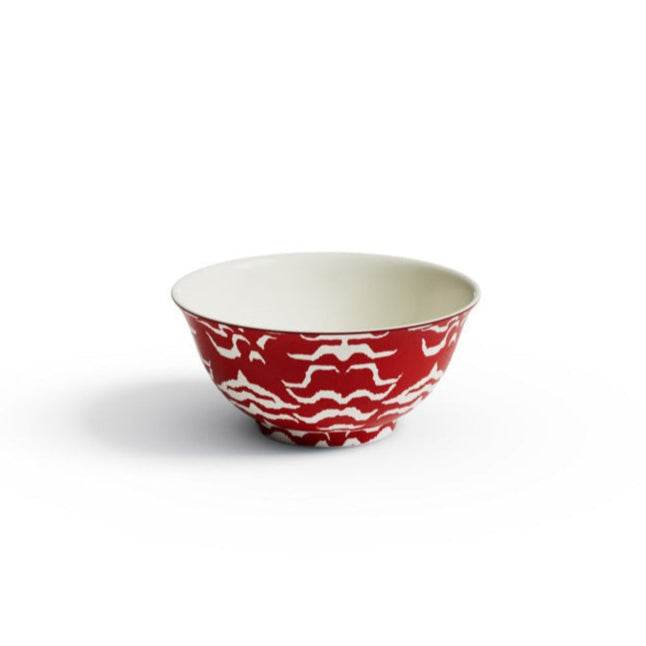 The hand-painted Indian Tiger design reinterprets classical dinnerware with fiery tiger prints and blooming florals in bold red, periwinkle, green, and yellow hues, creating a vivid, mix-and-match statement for contemporary tablescapes.
