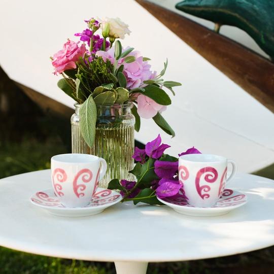 Revisited and refreshed in its summer two tone pink version, the Athenee Peacock tableware is here to brighten up any table setting. Inspired by a beautiful Athenian staircases found in a neoclassical building downtown, this pattern is based on a repetitive motion of the Peacock pattern placed side by side create a feeling of movement. Follow Themis’s advice and place the dinner plate next to the dessert plate, giving a beautiful texture to a lovely summer table setting.
