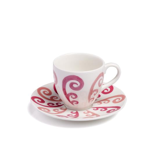 Handcrafted coffee or tea cup in fine porcelain adorned with hand-painted Peacock pattern in two-tone pink.