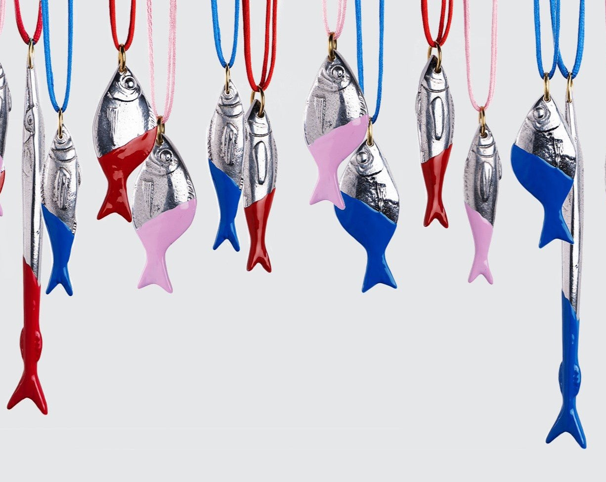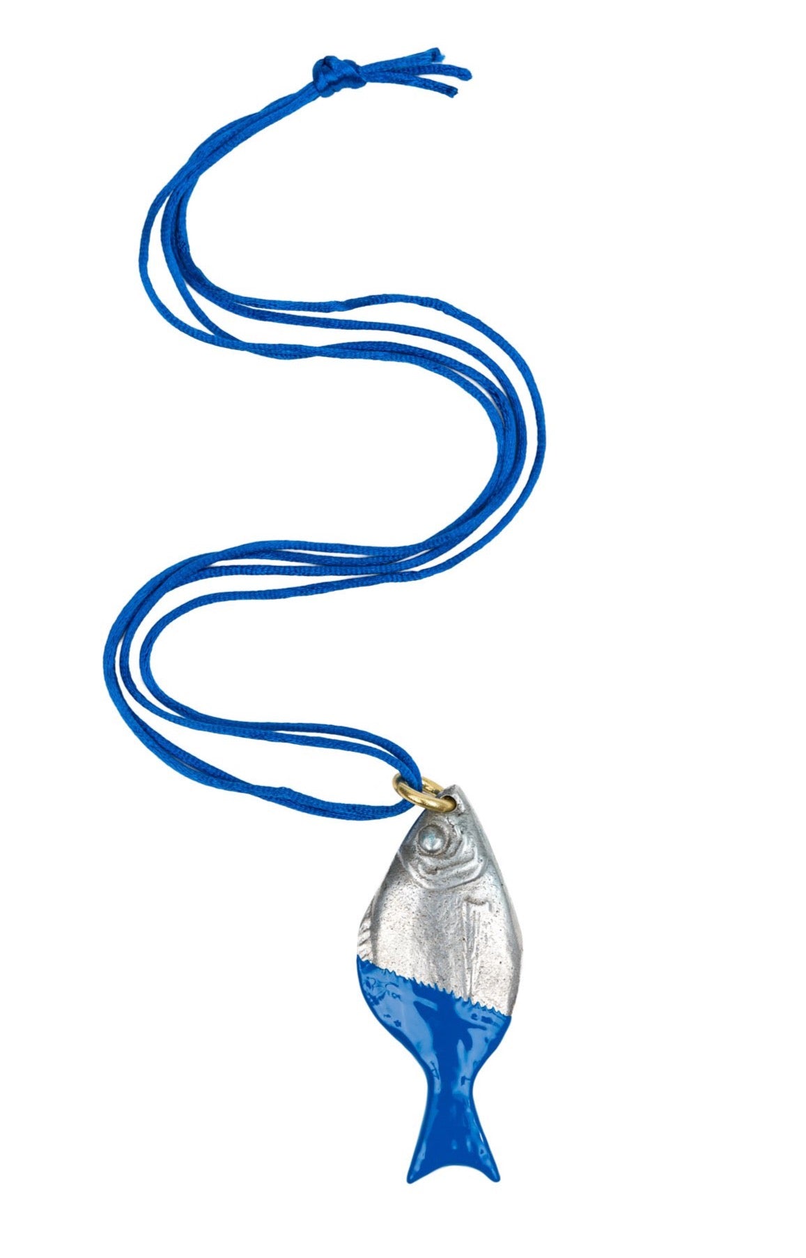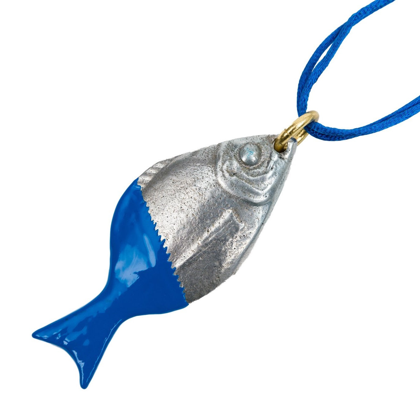 Inspired by the fish of the Aegean sea, this pendant makes a bold statement!   The realistic, shimmering fish hangs from a double silk cord and is partially coated in deep blue.