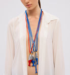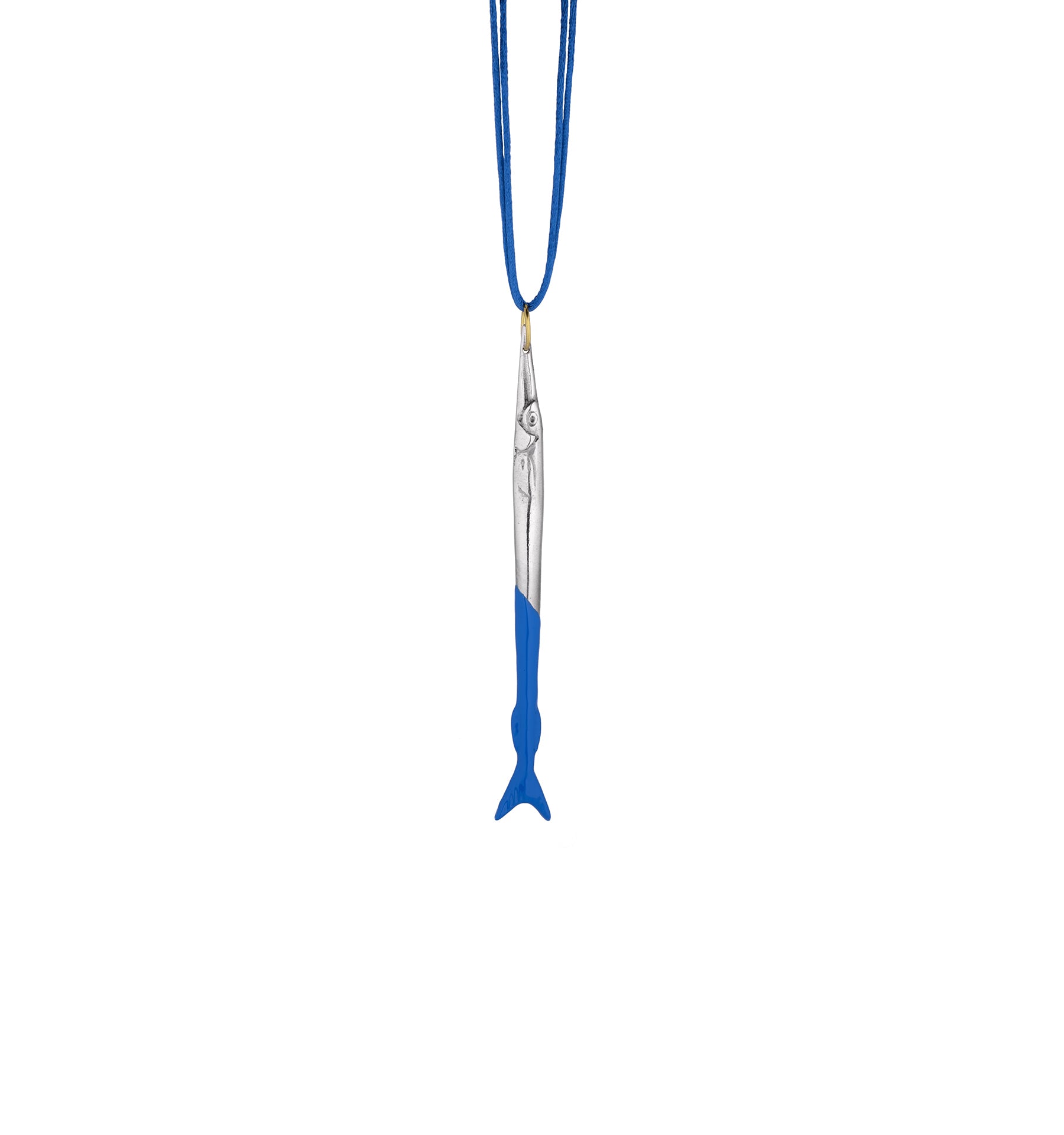 Inspired by the fish of the Aegean sea, this pendant makes a bold statement! The realistic, shimmering fish hangs from a double silk cord.