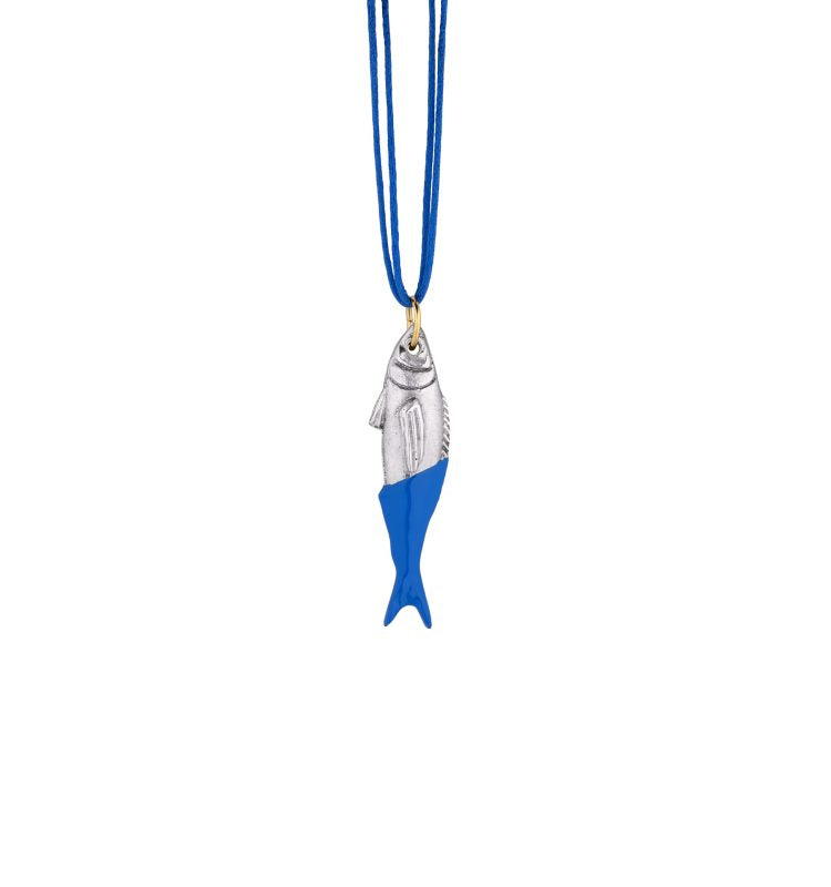 Inspired by the fish of the Aegean sea, this pendant makes a bold statement!   The realistic, shimmering fish hangs from a double silk cord.