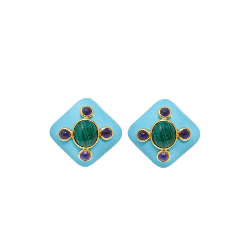 Grazia & Marica Vozza Turquoise, Malachite & Amethyst Square Drop Earrings