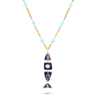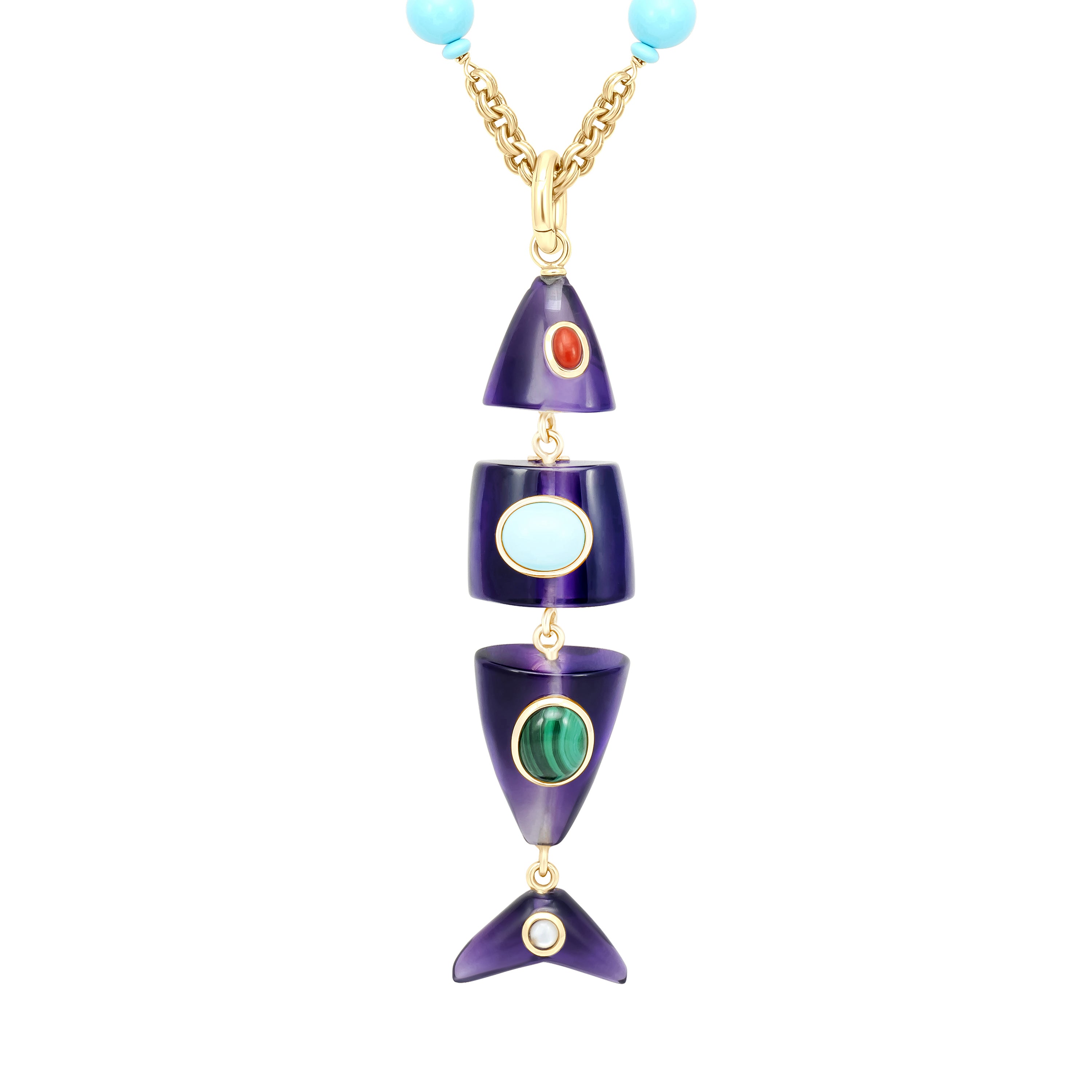 This handcrafted Large Fish necklace features a sculptural Amethyst fish charm in a multi-segment design, accented with Mother of Pearl, Turquoise resin, Coral resin and Malachite details. The charm is set with a detachable bail in 9K yellow gold and suspended from a beaded chain composed of Amethyst, Turquoise resin and Coral resin elements, finished with workmanship in vermeil for a striking, statement-making Capri silhouette.