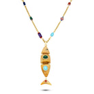 This handcrafted Large Fish necklace features a sculptural Yellow Chalcedony fish charm in a multi-segment design, accented with Turquoise resin, Coral resin, Malachite and Lapis Lazuli details. The charm is set with a detachable bail in 9K yellow gold and suspended from a colorful beaded chain composed of assorted multicolor hard stones, finished with workmanship in vermeil for a joyful, eclectic Capri-inspired statement piece.