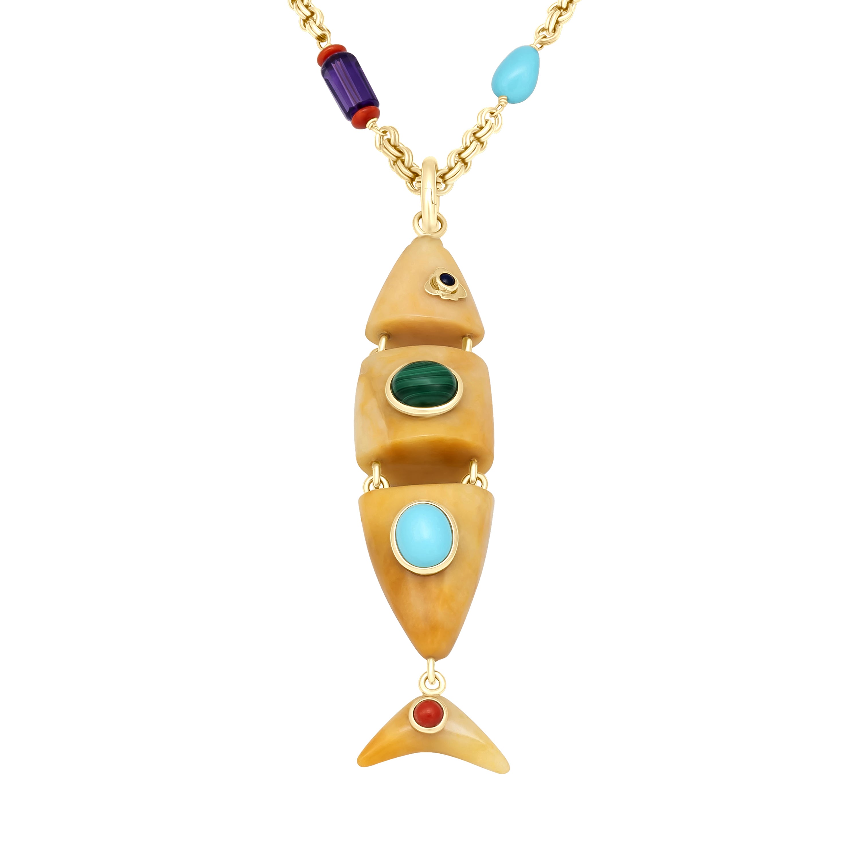 Grazia & Marica Vozza Large Fish Yellow Chalcedony, Turquoise, Coral & Malachite Necklace