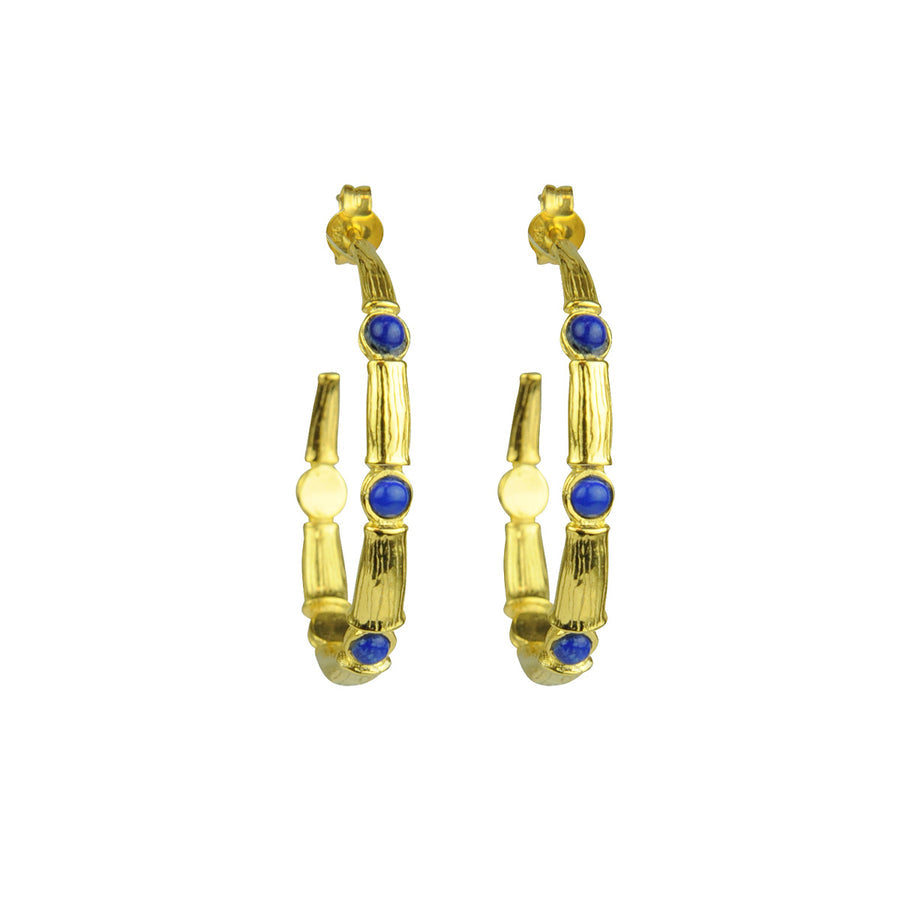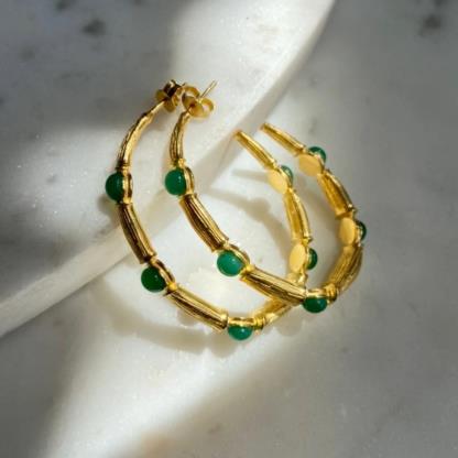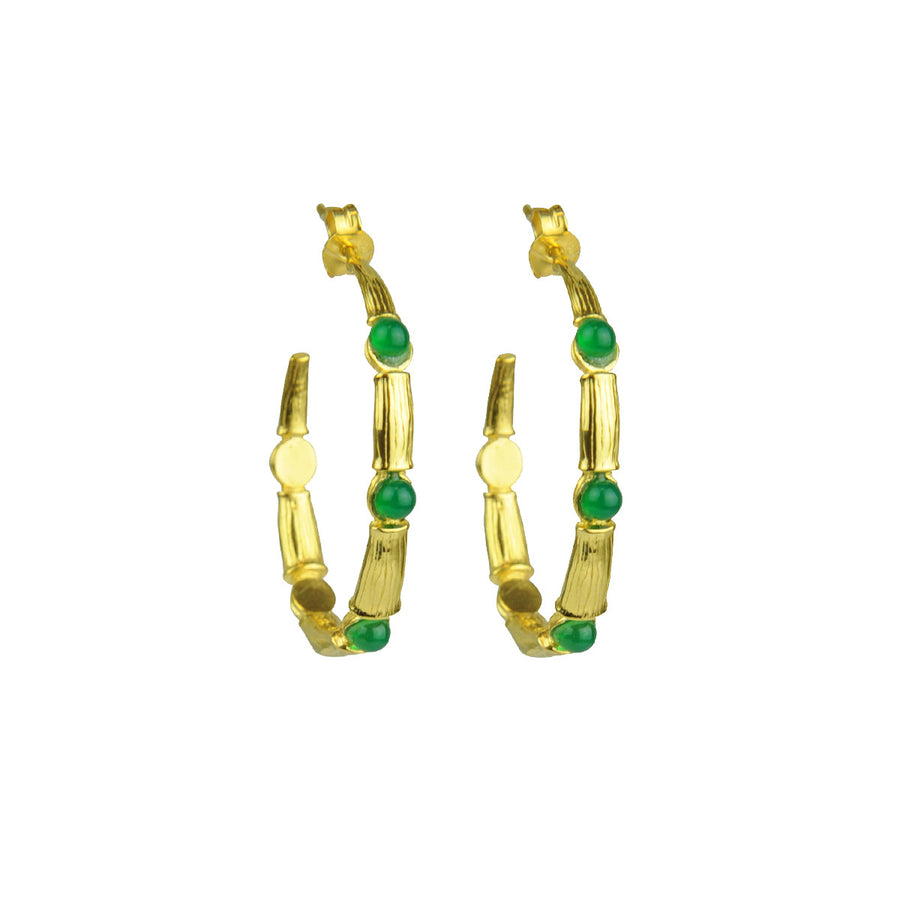 Gold plated brass bamboo hoops with cabochons and 925 silver studs.