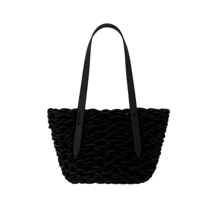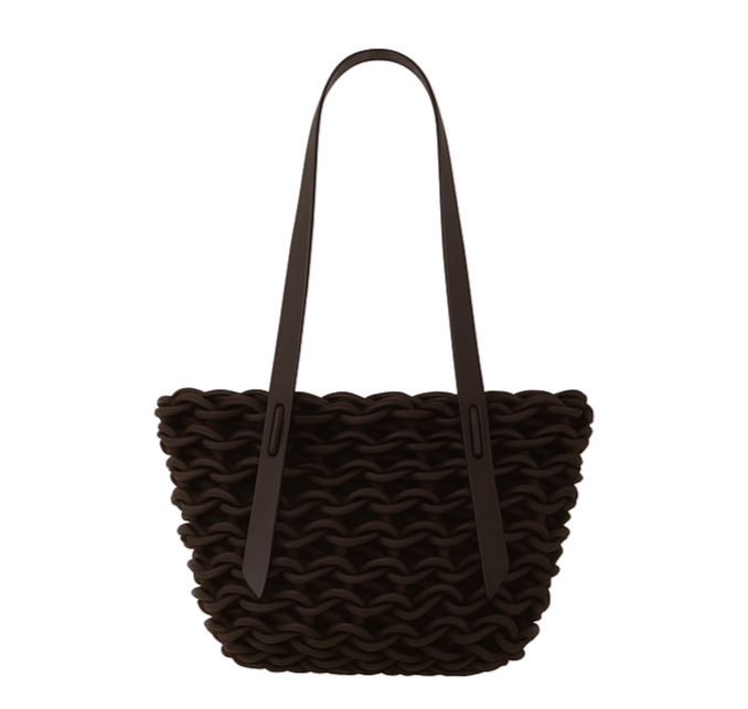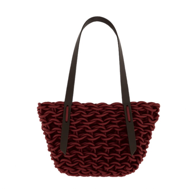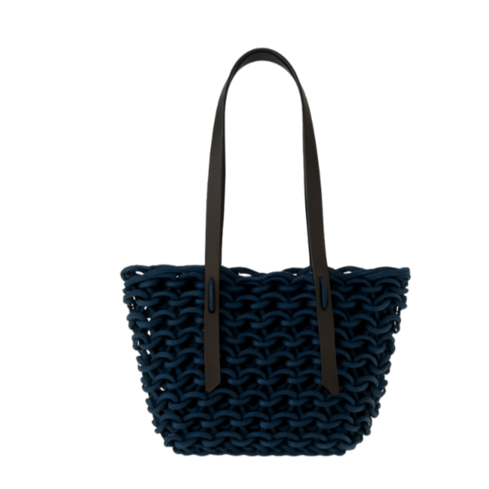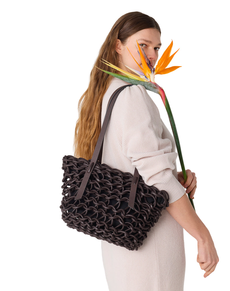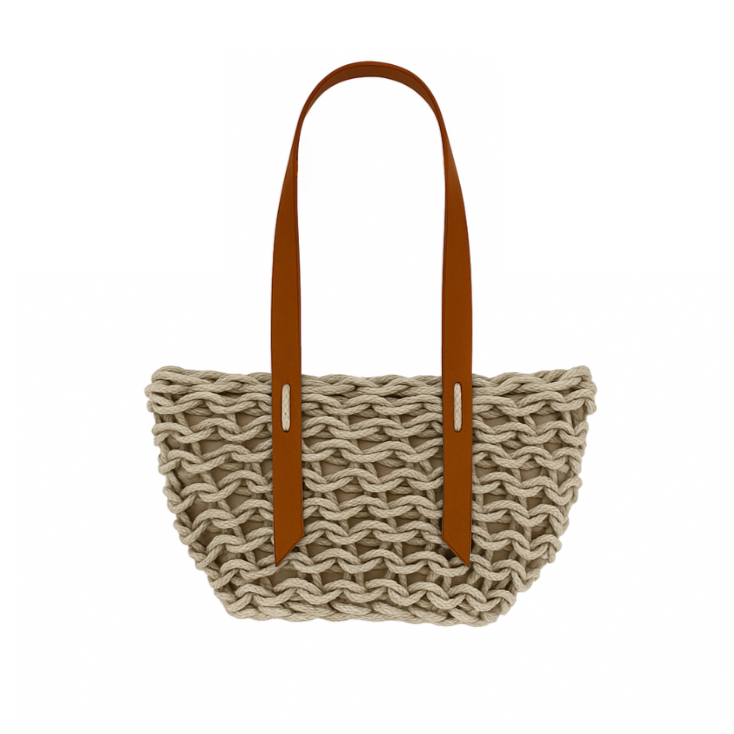Handmade woven bag realized with natural waxed cotton rope and biodegradable leather.