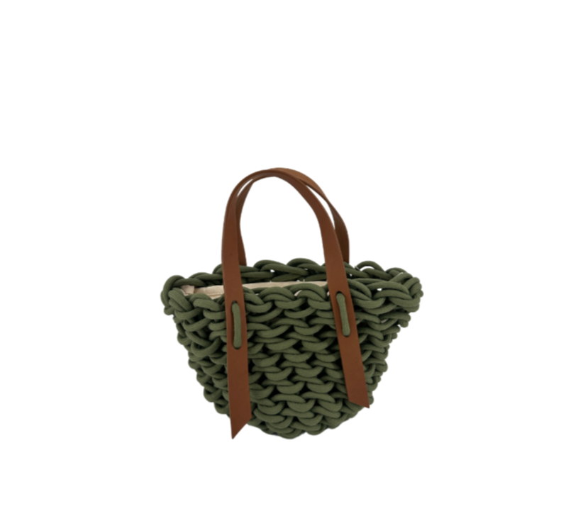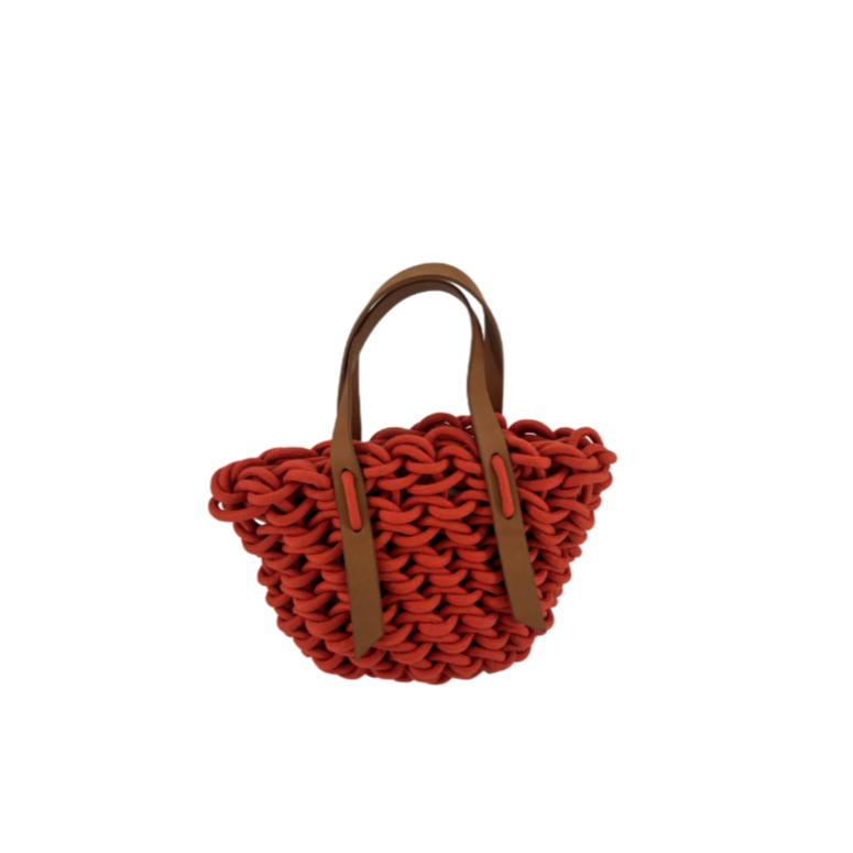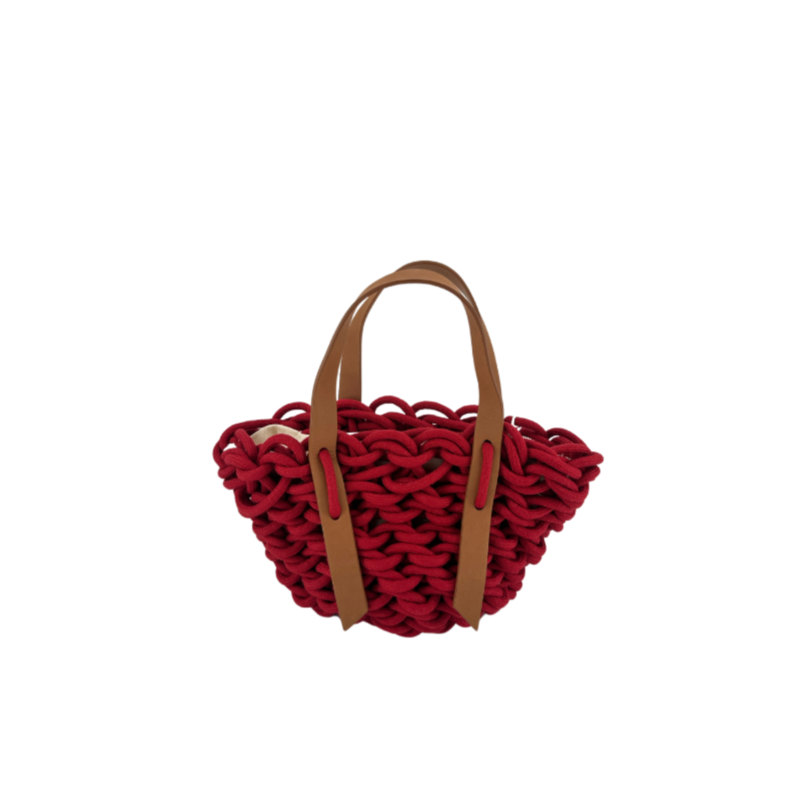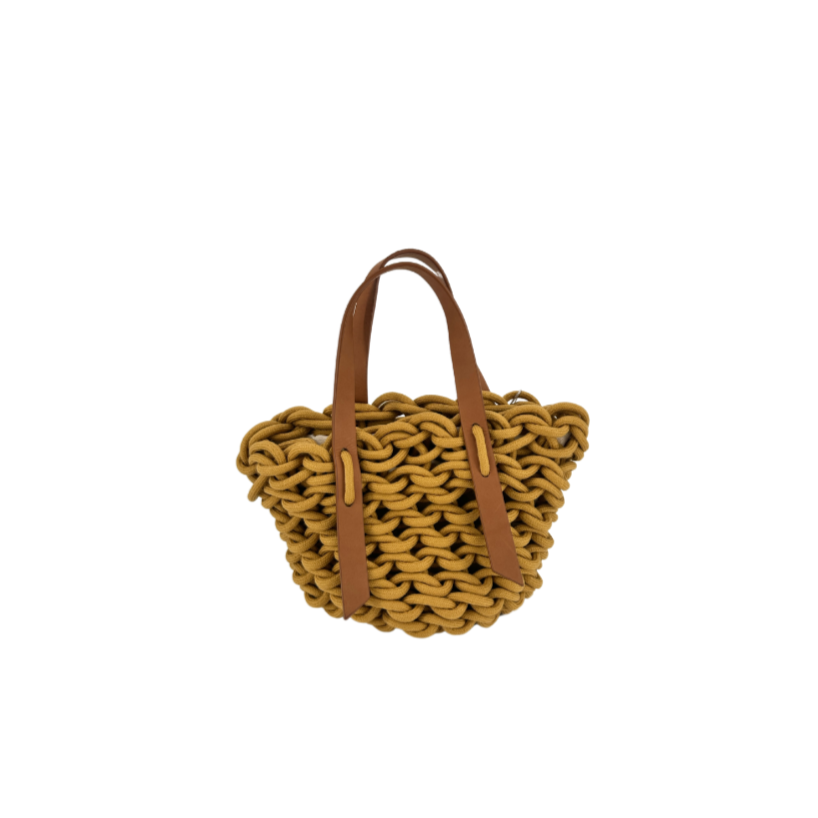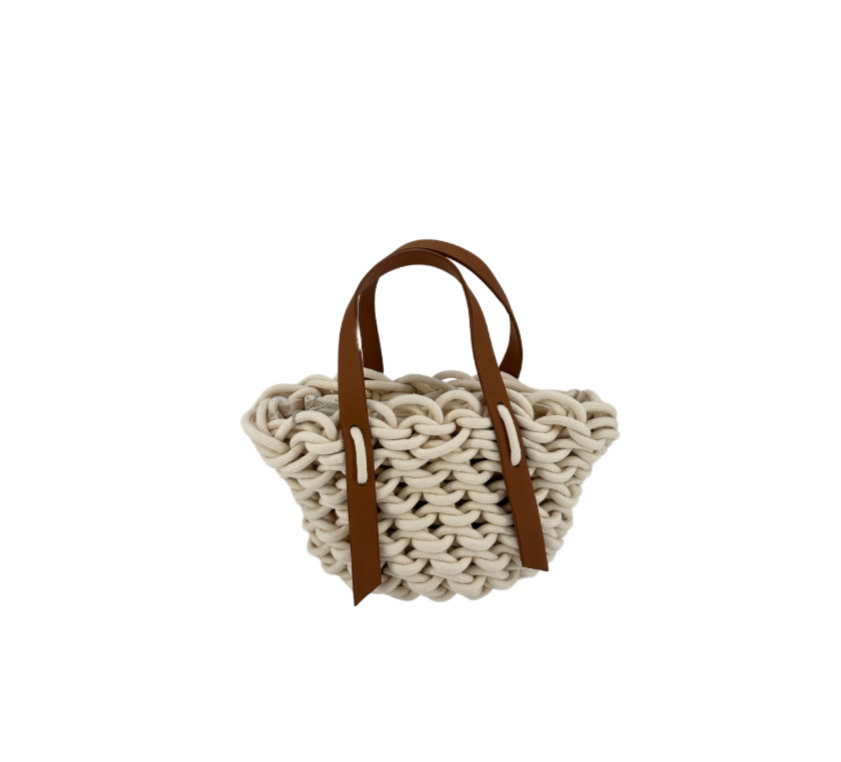 Handmade woven bag realized with natural waxed cotton rope and biodegradable leather.