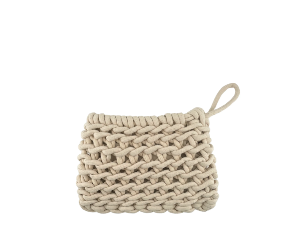 This sustainable clutch, handcrafted in Perugia, Italy from organic cotton ropes originally produced as cotton wicks for oil lamps. Each piece is handmade and thus unique.