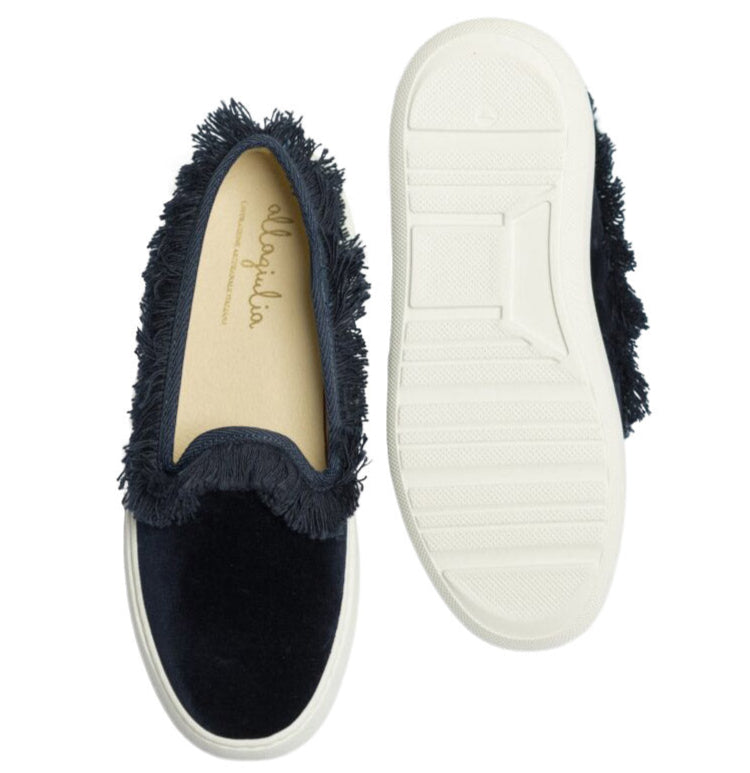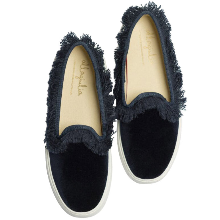 Blue velvet slip-on edged with grosgrain and iconic matching fringe trimmings. Leather interior. Sustainable faux leather interior. The insole is a soft and elastic anatomical footbed.