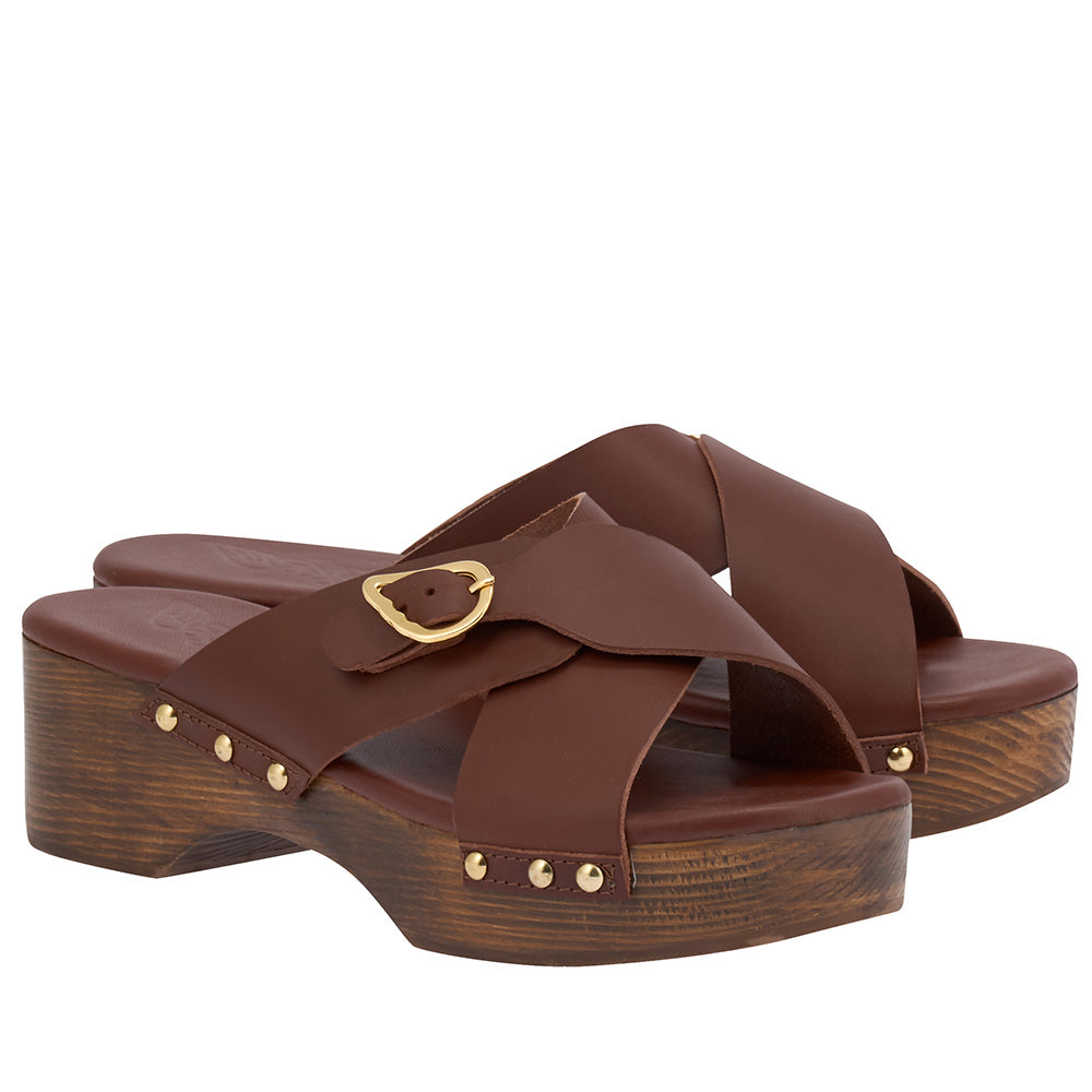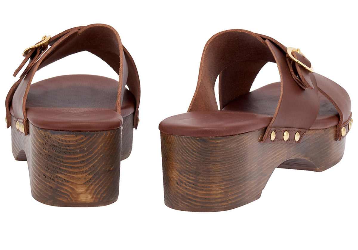 Step into summer with Ancient Greek Sandals’ chestnut clogs. This handmade pair is cut with soft crossover leather straps and a wooden sole and heel. Plus, they feature our signature wing buckle at the front.