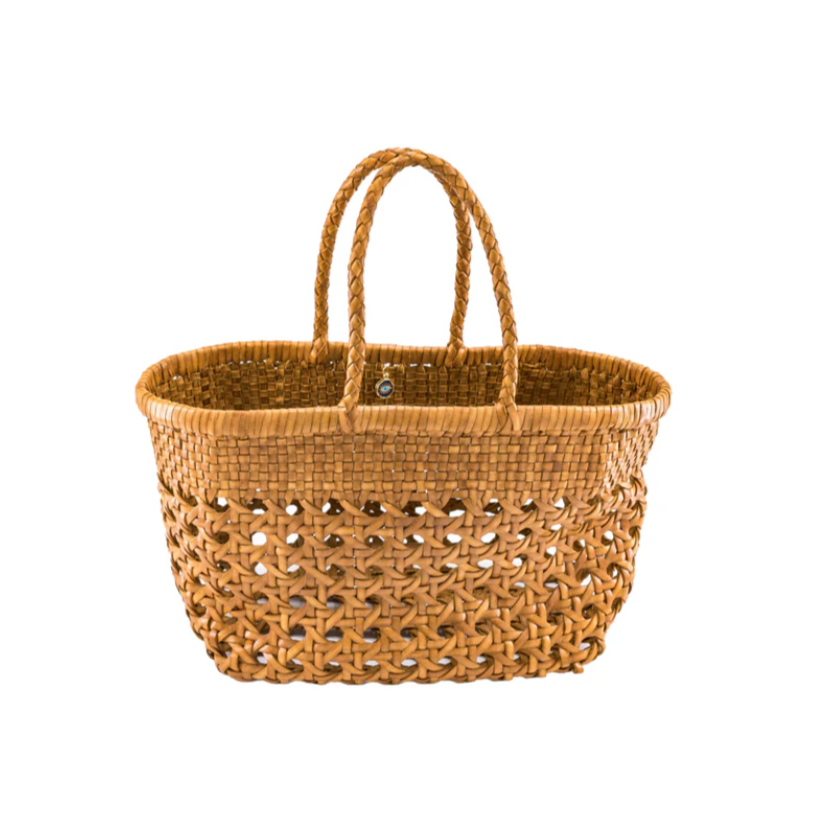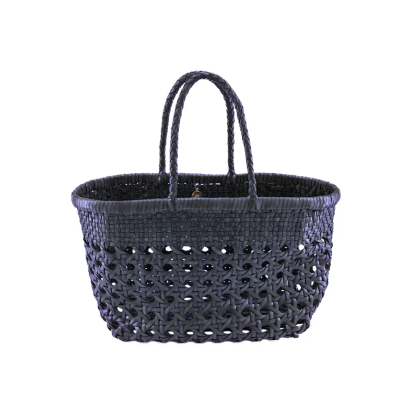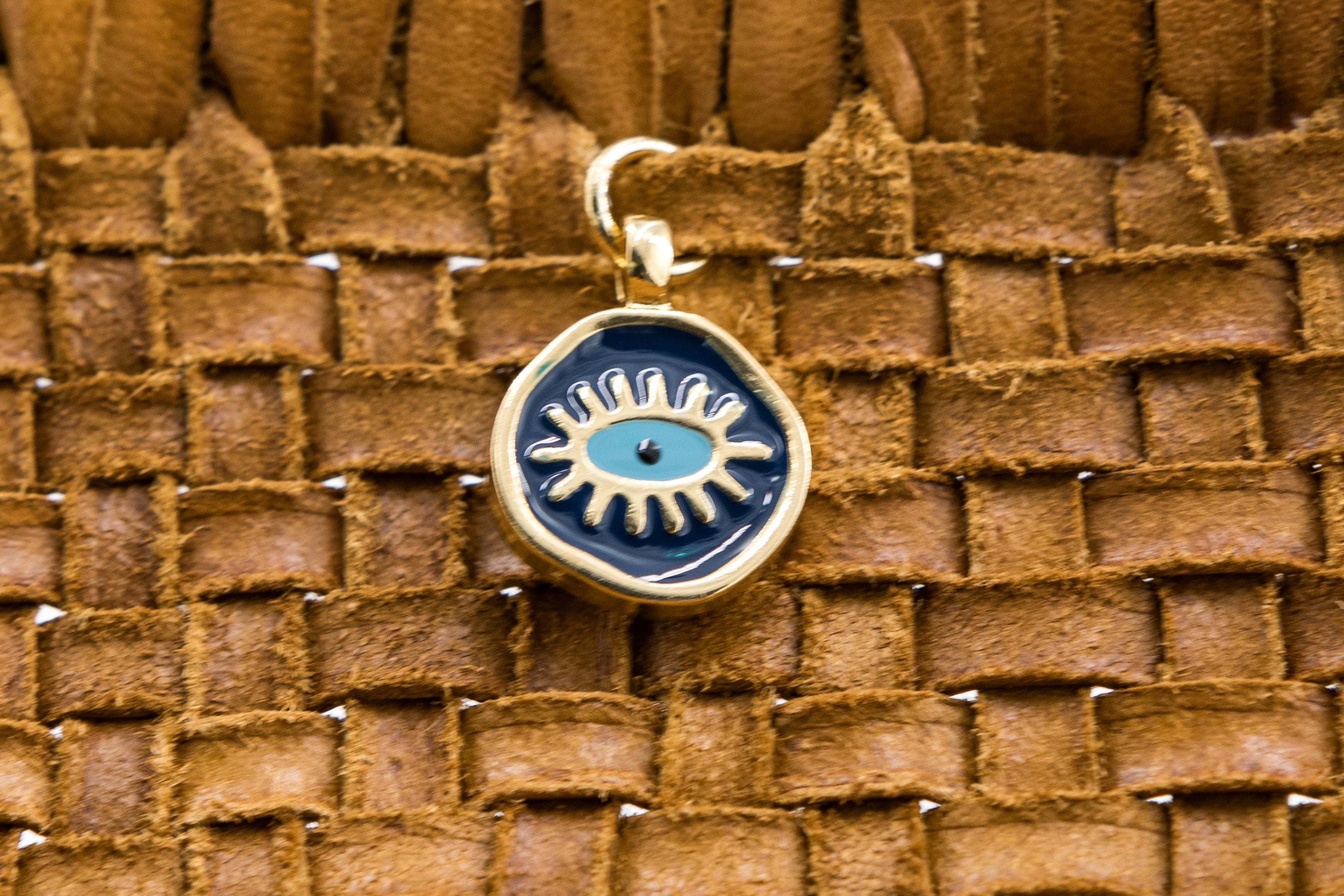 Crafted from rich leather in a basketweave pattern, this chic leather basket bag is both stylish and practical. Adorned with an evil eye for protection.