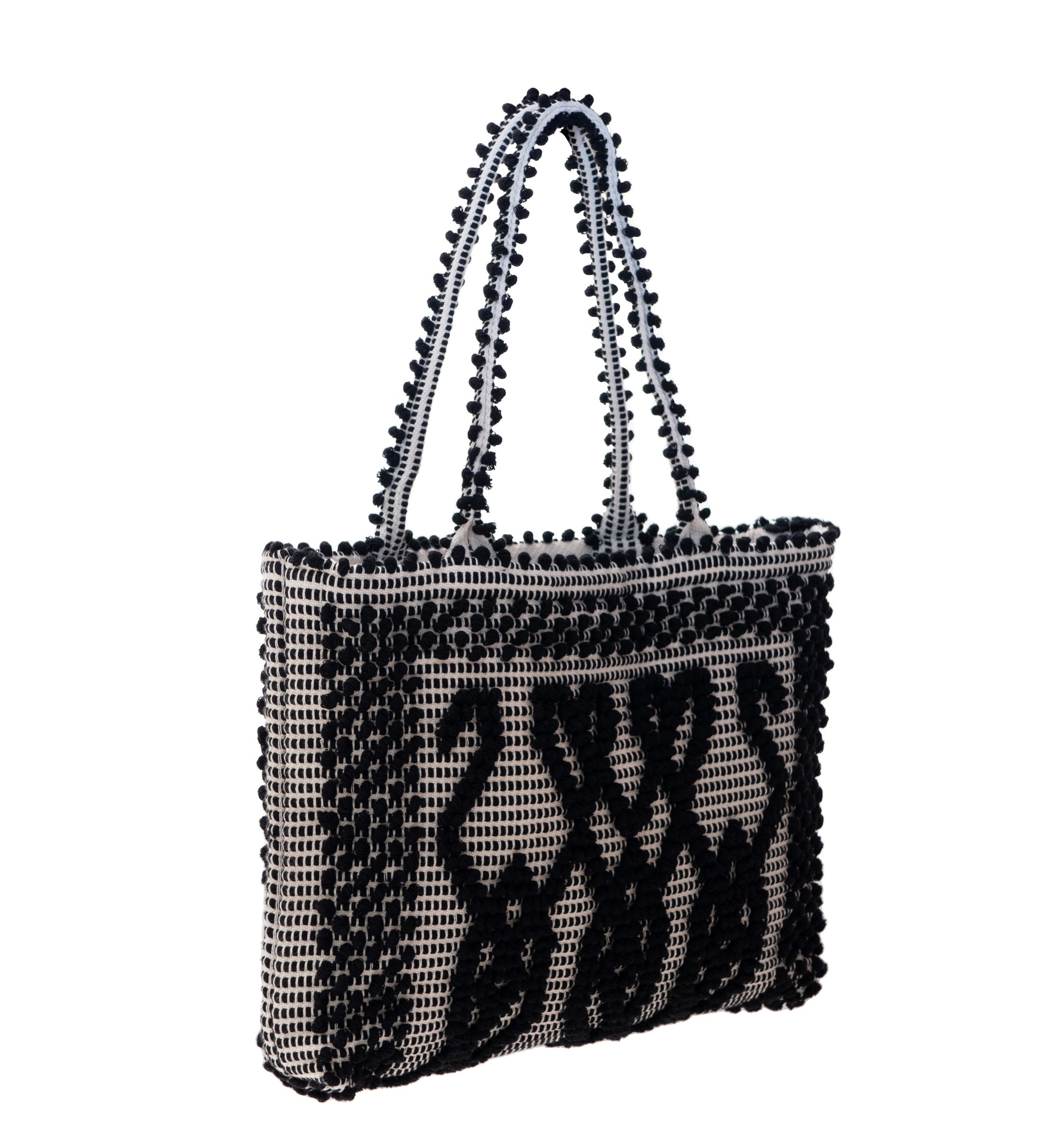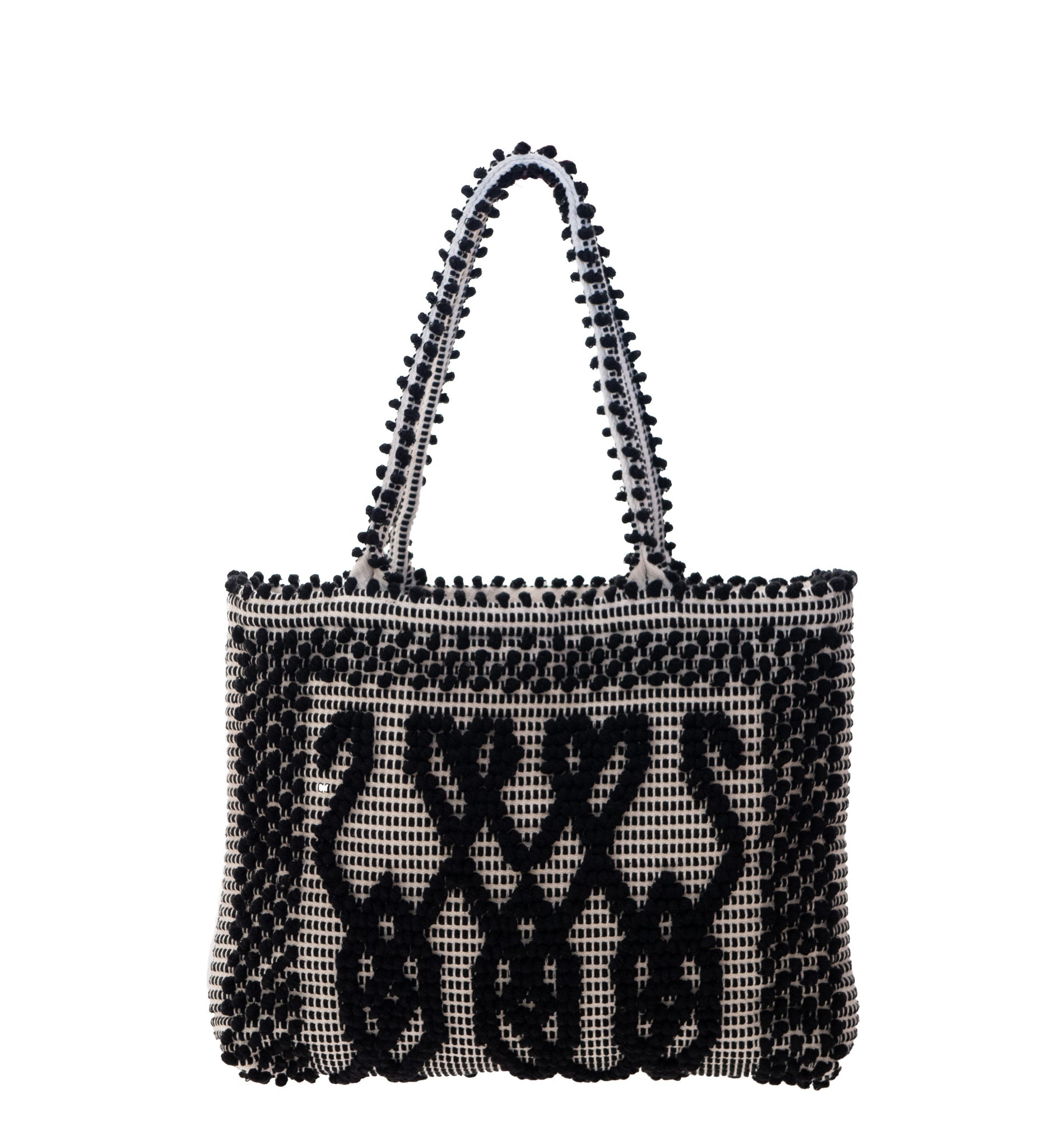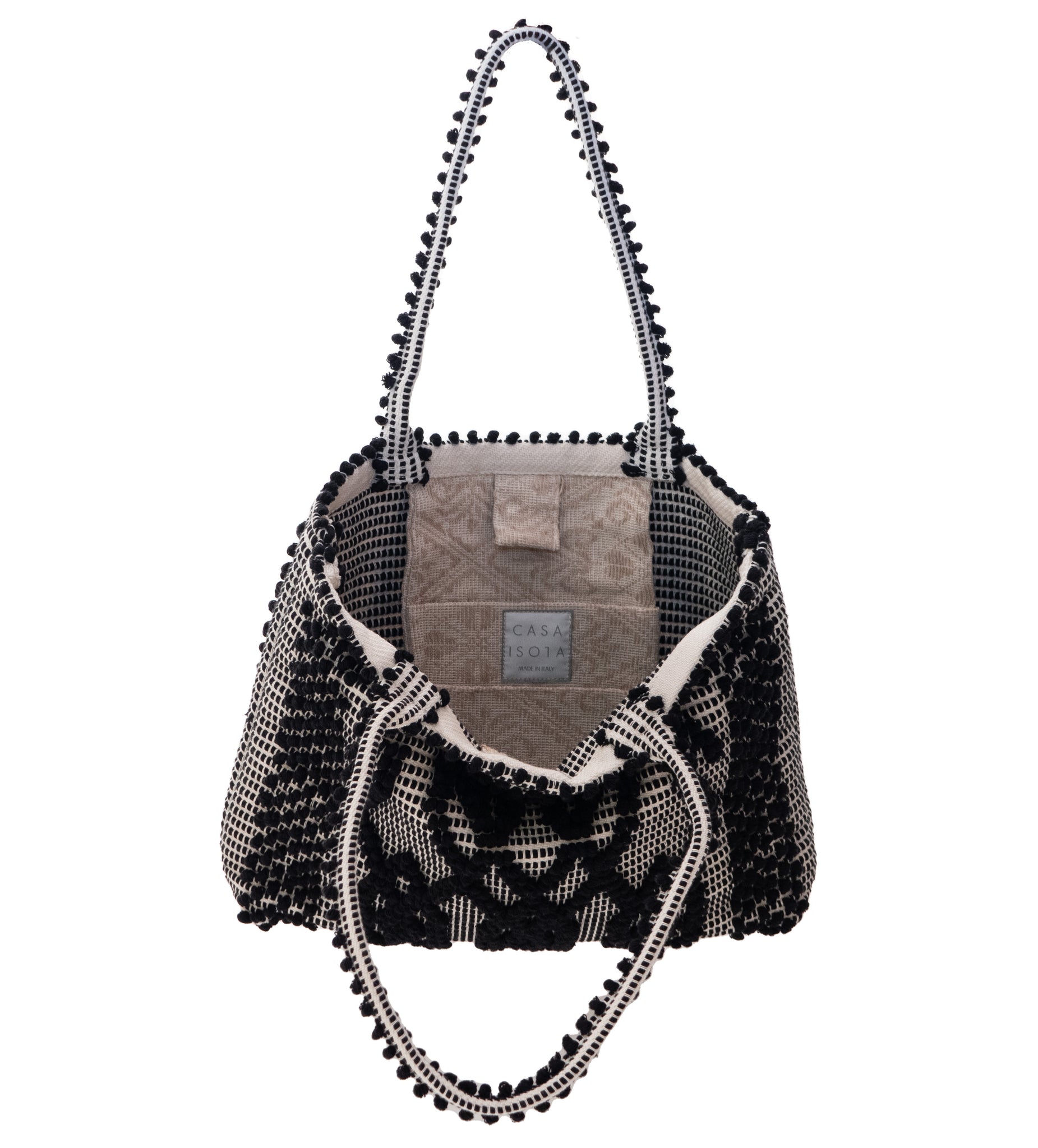 Geometric pattern woven cotton tote with double top handles. Interior includes slip pockets. Two small fringe tassels on sides.