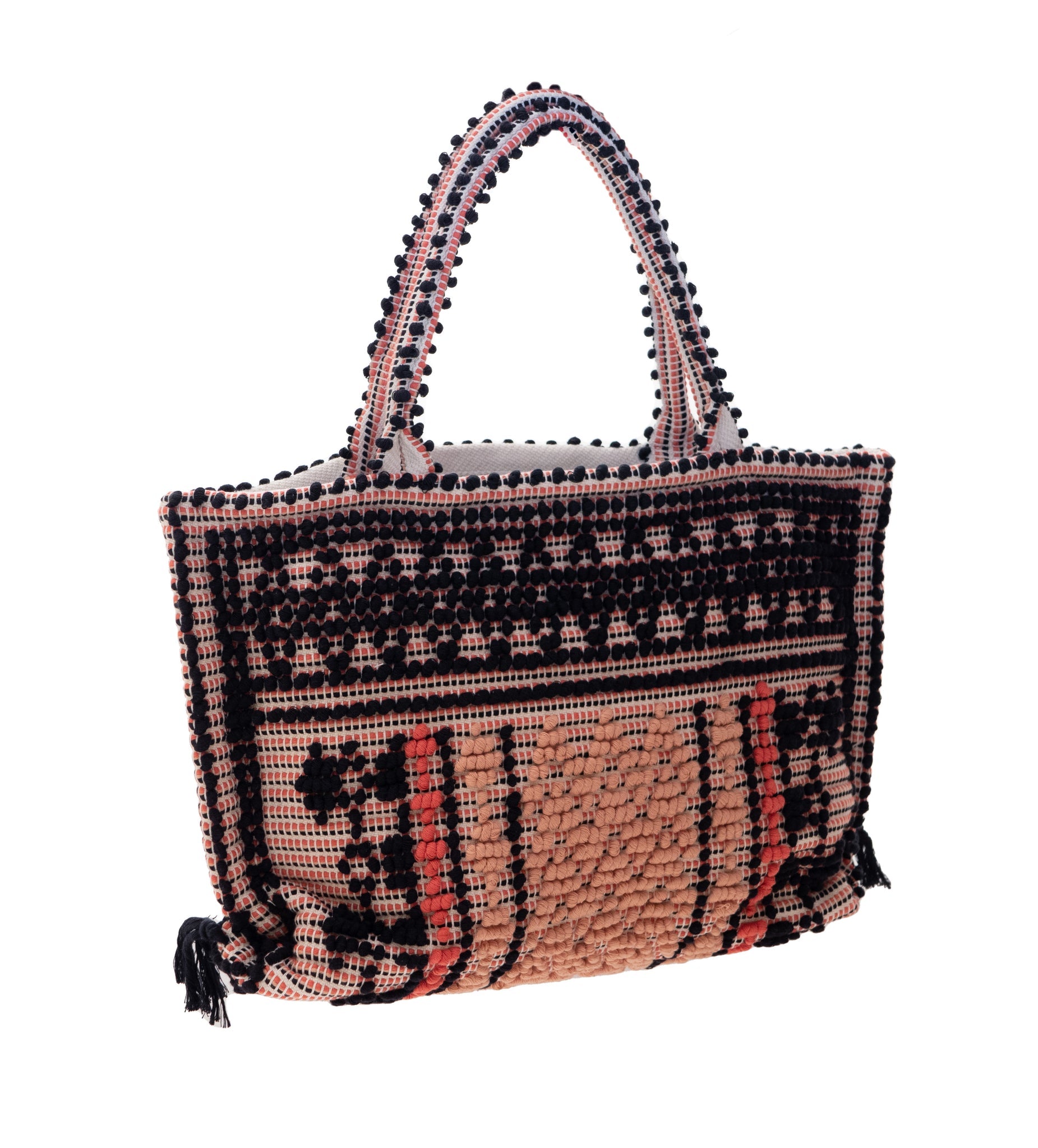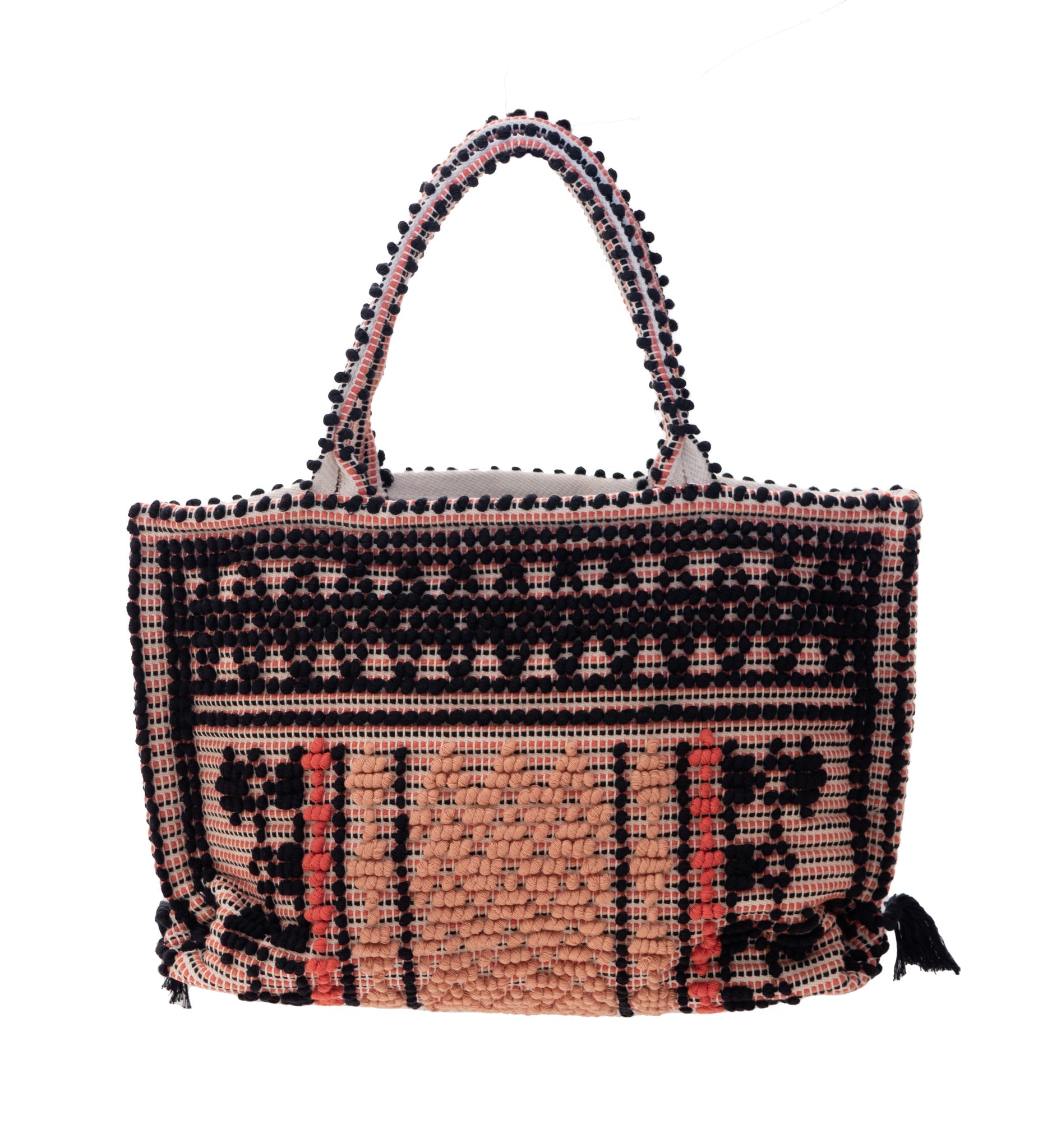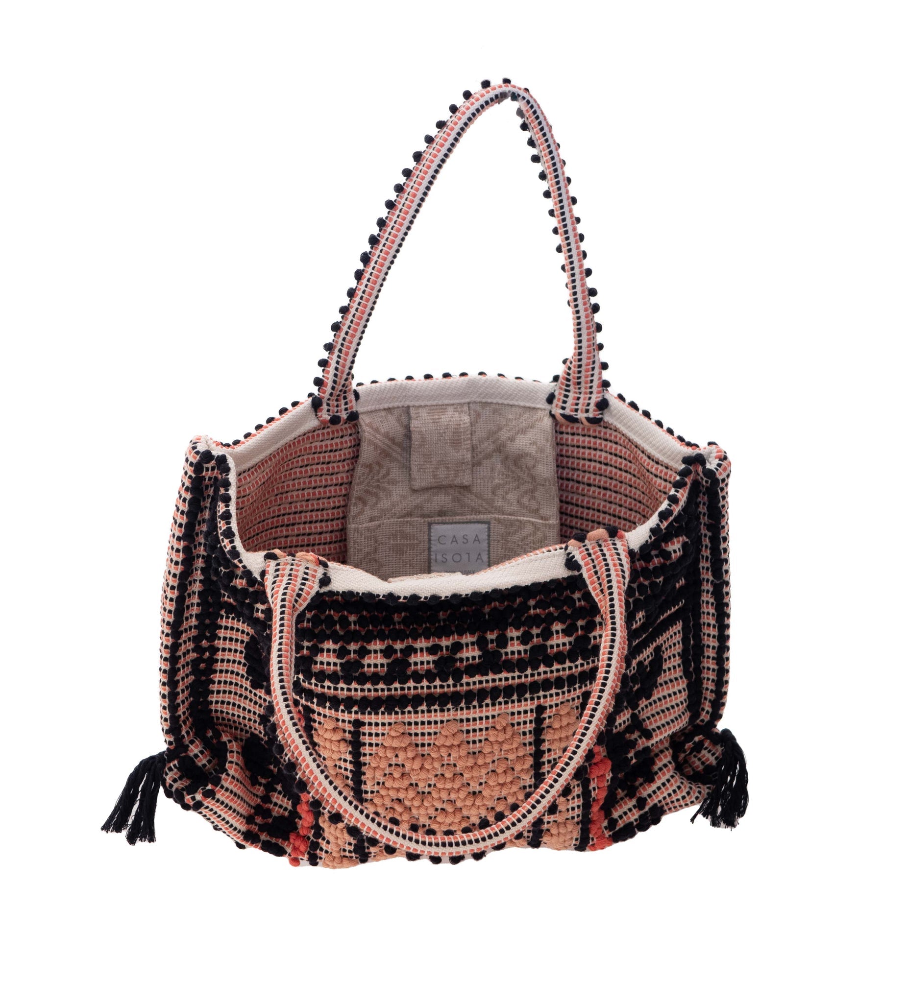 Nude Black and Red geometric striped pattern woven cotton tote with double top handles. Interior includes slip pockets. Two small fringe tassels on sides.