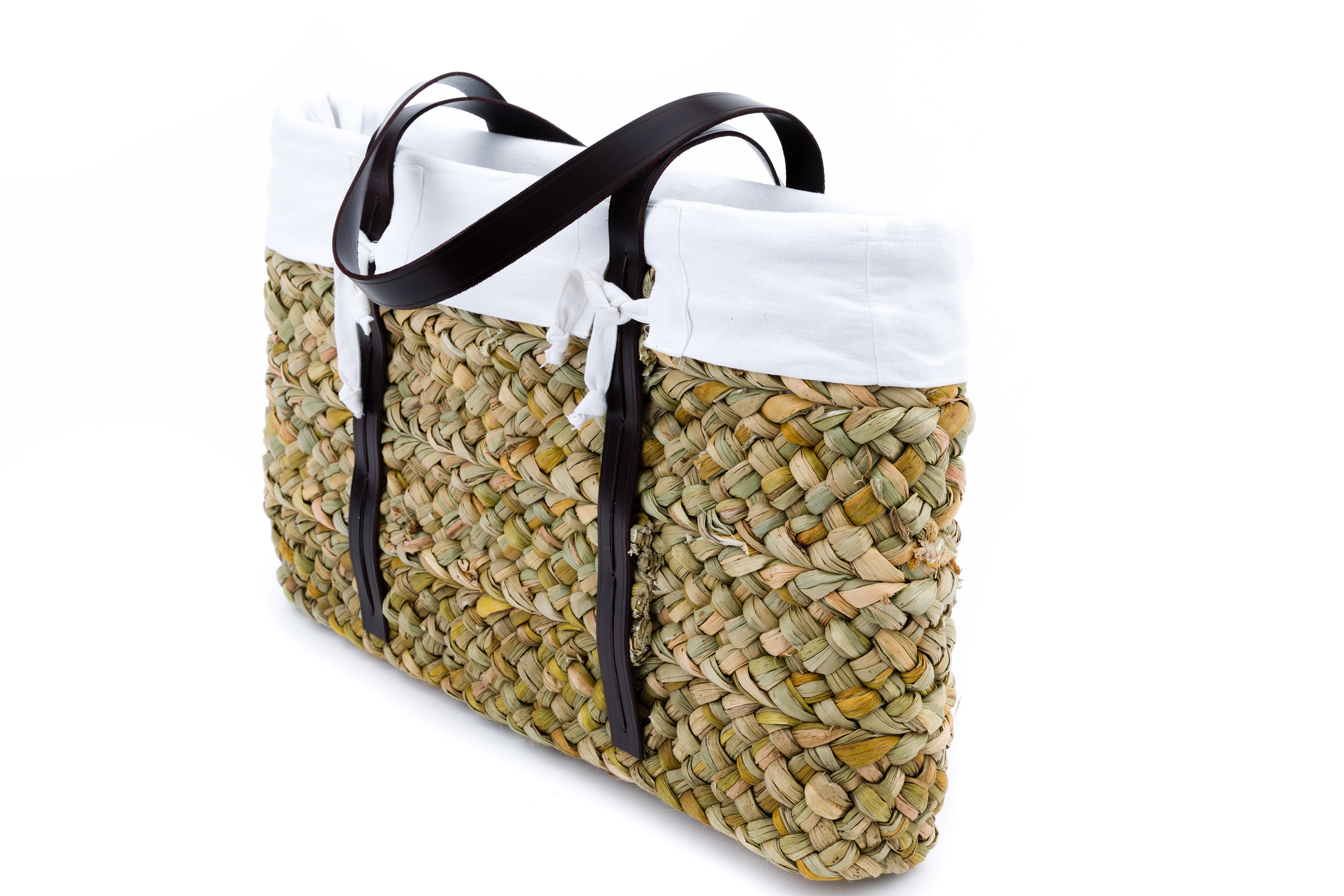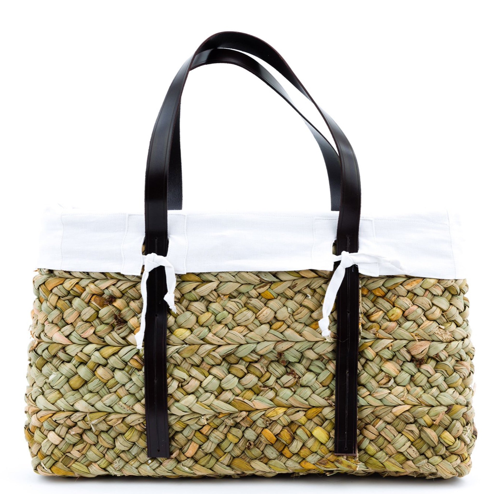 The perfect accessory for the market or beach! Surprisingly durable, this bulrush shopper has a French linen lining and leather handles. The rush dries naturally in the sun and over time mellows from green to a warm honey color. Interwoven with sprigs of lavender. Handmade in the UK.