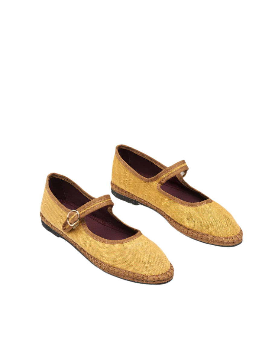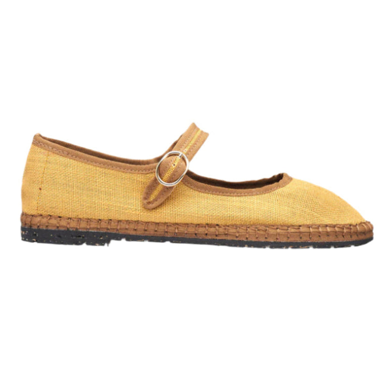 - Aged linen mary jane in mustard with beige piping and buckle closure.