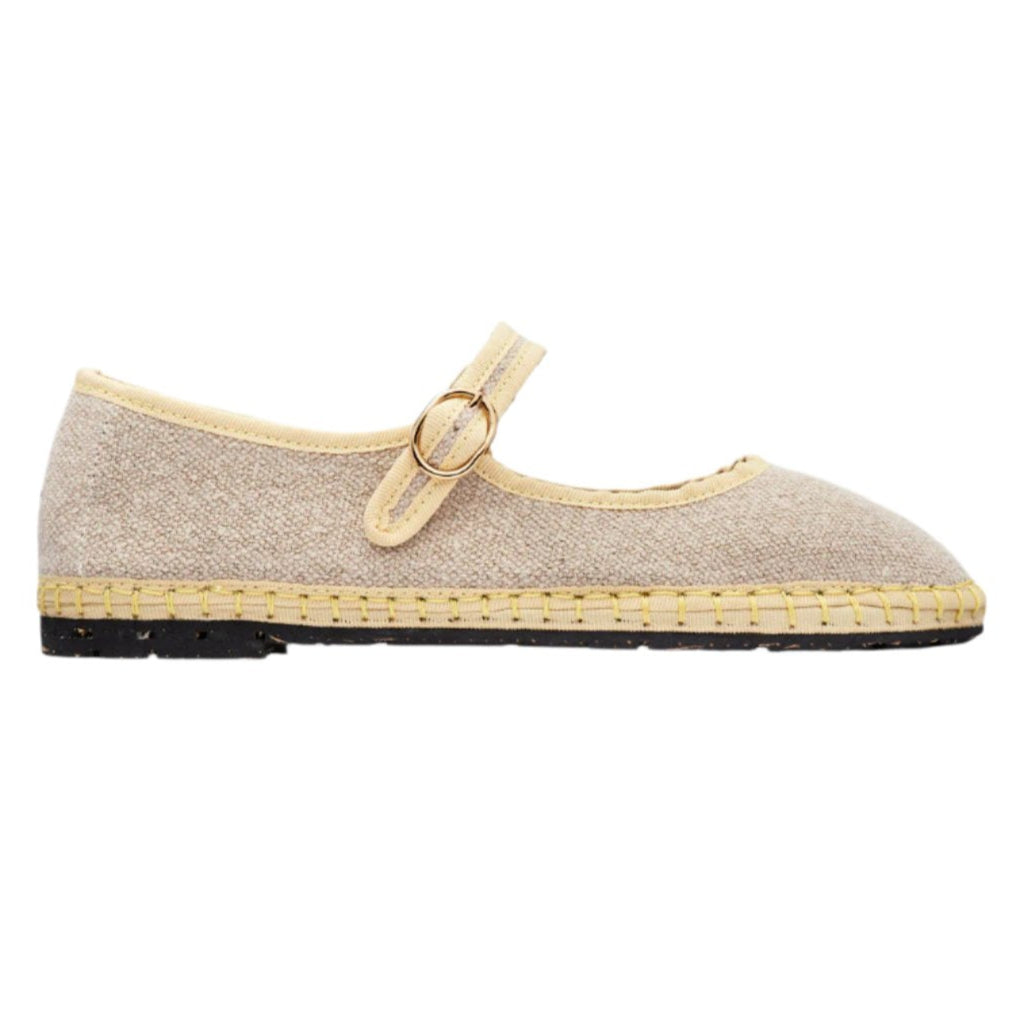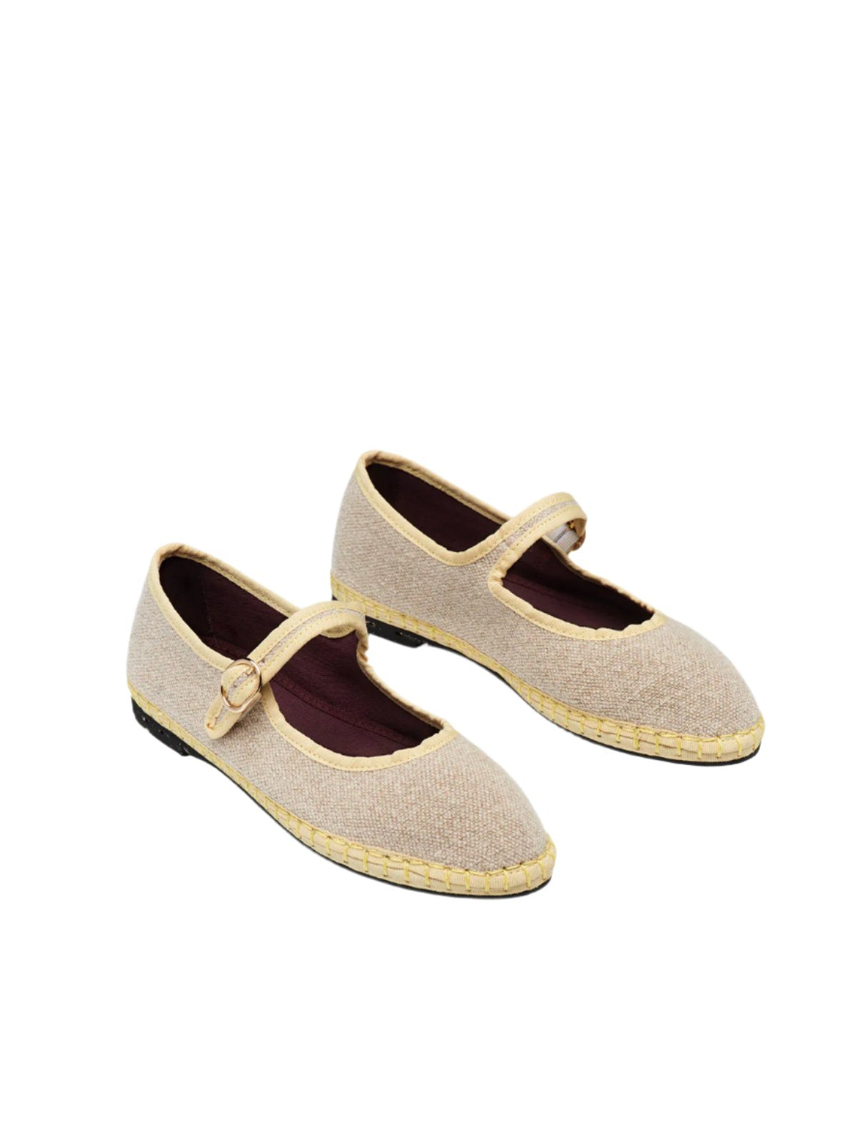 - Linen mary jane in light beige with light yellow piping and buckle closure.