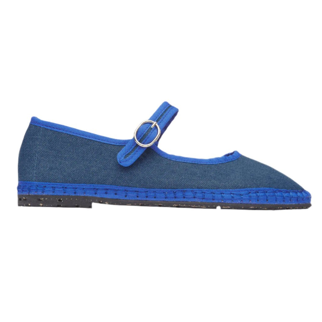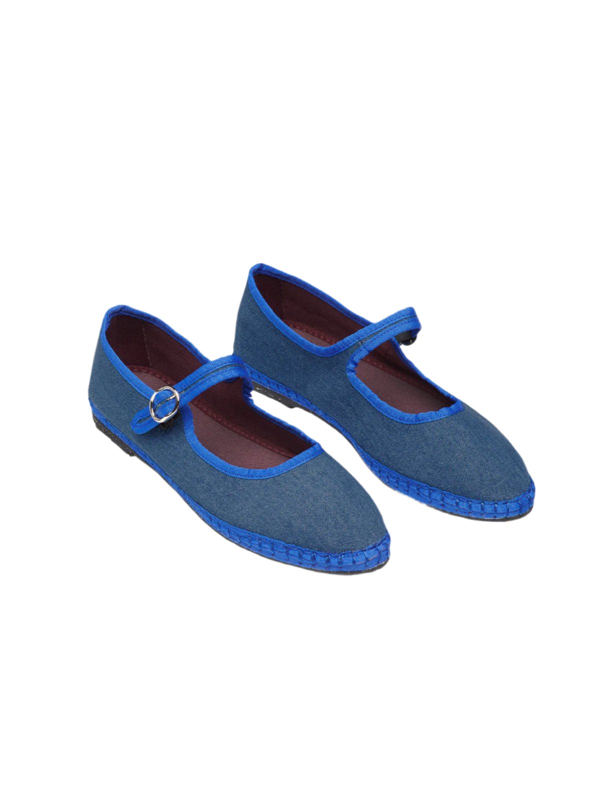 - Denim mary jane in dark blue with blue piping and buckle closure.