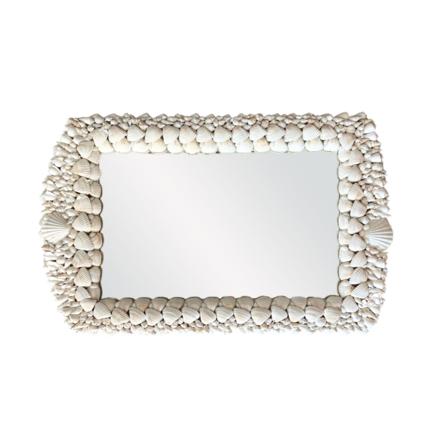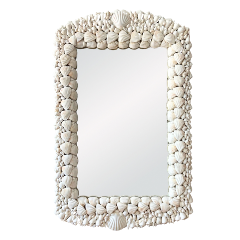 This oval mirror beautifully combines artisan craftsmanship and coastal allure. Decorated with delicate white seashells, it exudes light, elegance, and timeless seaside charm.