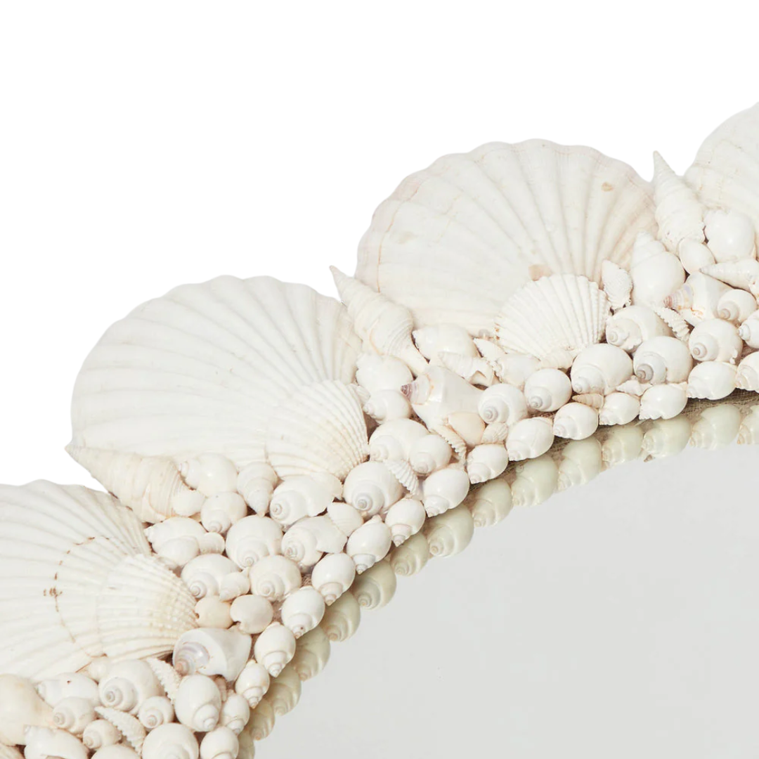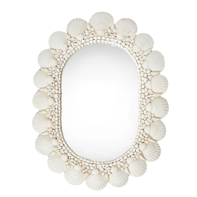 This oval mirror beautifully combines artisan craftsmanship and coastal allure. Decorated with delicate white seashells, it exudes light, elegance, and timeless seaside charm.