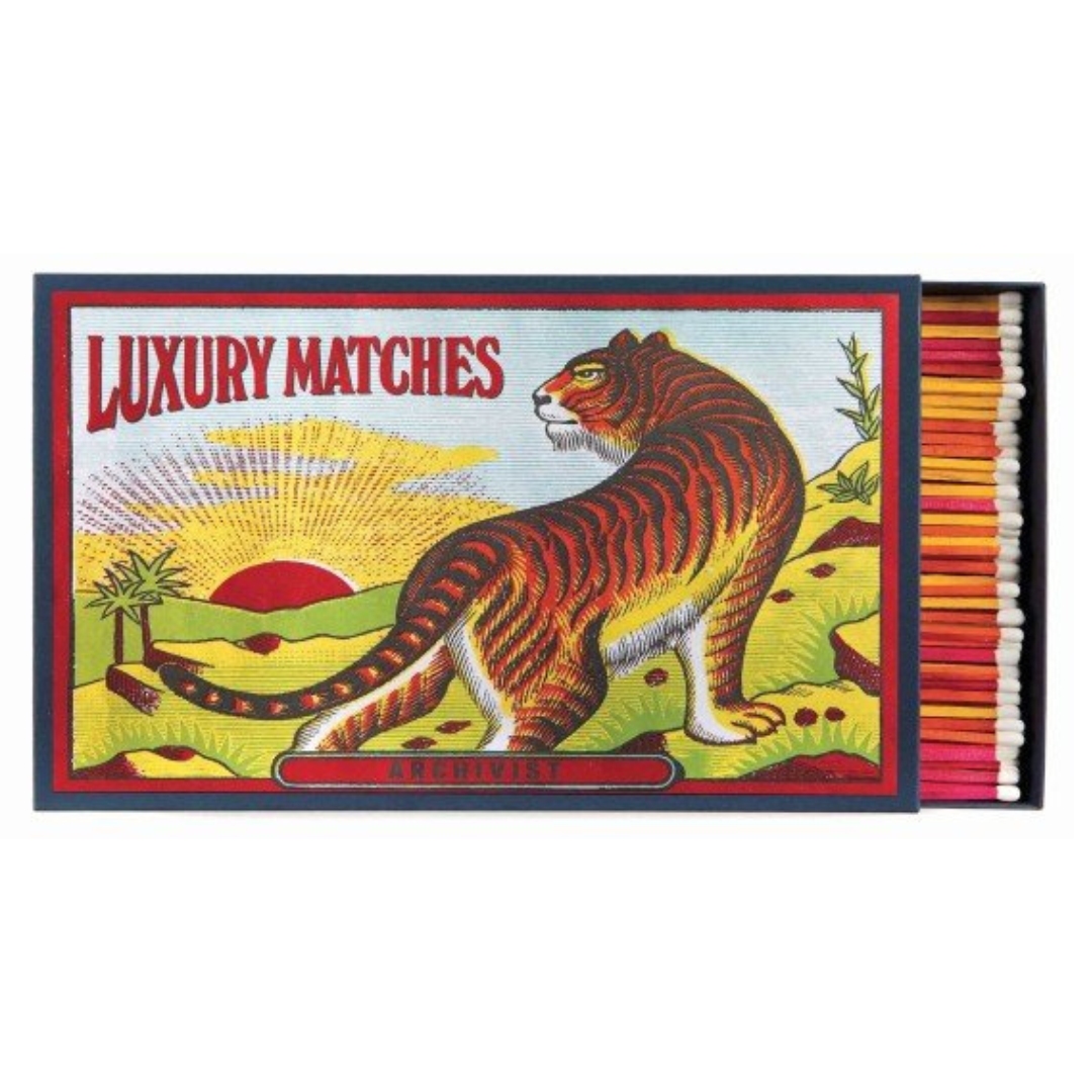 Bigger and better than any other matchbox! This madly magnificent match box is supersized and filled with a riot of colorful extra long match sticks, a must for any match lover. Getting herself to a suitable vista to watch the sunrise, or perhaps, to look for her next meal. Actually, we prefer the sunrise version. Either way this gorgeous tiger means business, and we absolutely adore her fierce gaze.