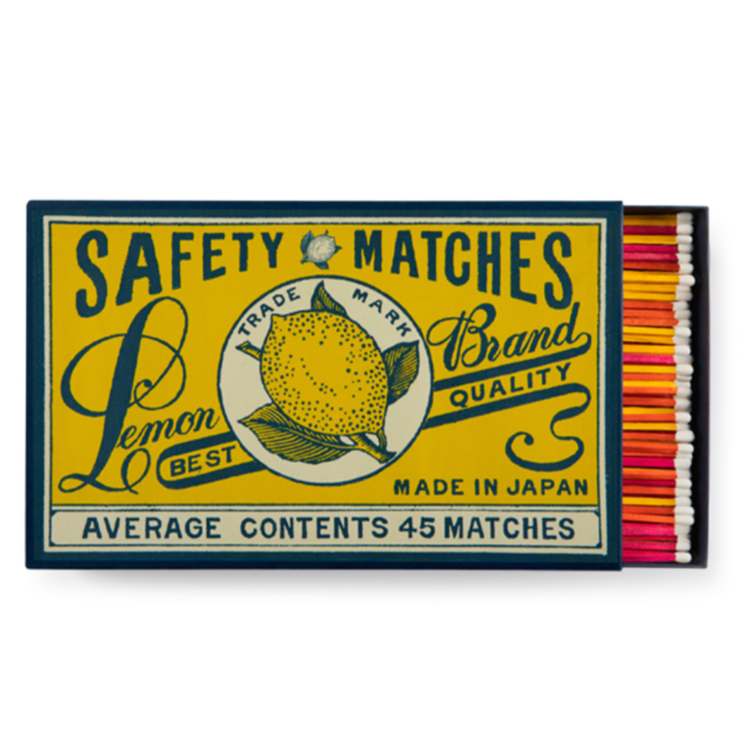 Are you looking for the perfect matches for your summer tablescape? Well we just might have the design for you! This new giant 'Lemon Safety Matches' box cannot help but exude the feelings of summer. Inspired by a vintage food label with its bright yellow background and lemon illustration, this giant matchbox is the perfect addition to summer dinning - placed next to a pitcher or homemade lemonade you'll have a winning centrepiece.
