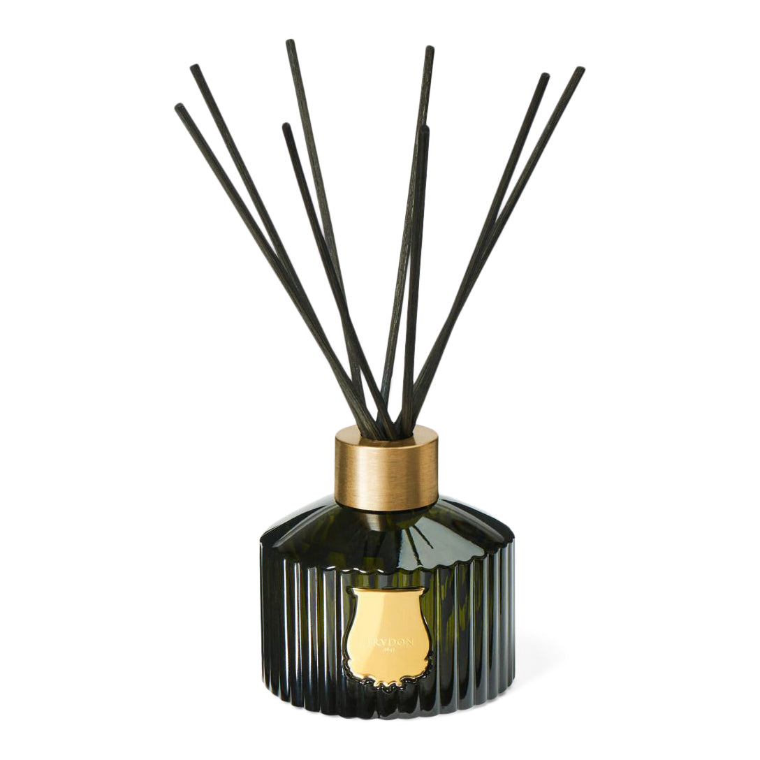 Shaped out of the emblematic Trudon-green glass, the fluted container of Le Diffuseur is adorned with a gold emblem. Handcrafted in the same glass manufacture as the candles, the diiffuser is topped with a 100% recyclable aluminum ring. Through it, you place 8 natural, black rattan sticks.