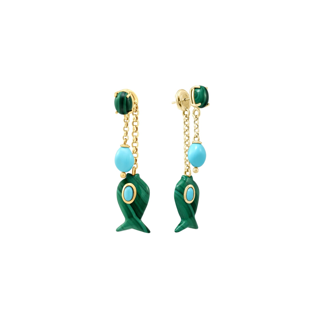 These handcrafted drop earrings feature sculpted Malachite fish accented with smooth Turquoise resin cabochons and suspended from delicate chains with Malachite studs, all set in 9K yellow gold for a playful Capri-inspired design with rich color and movement.