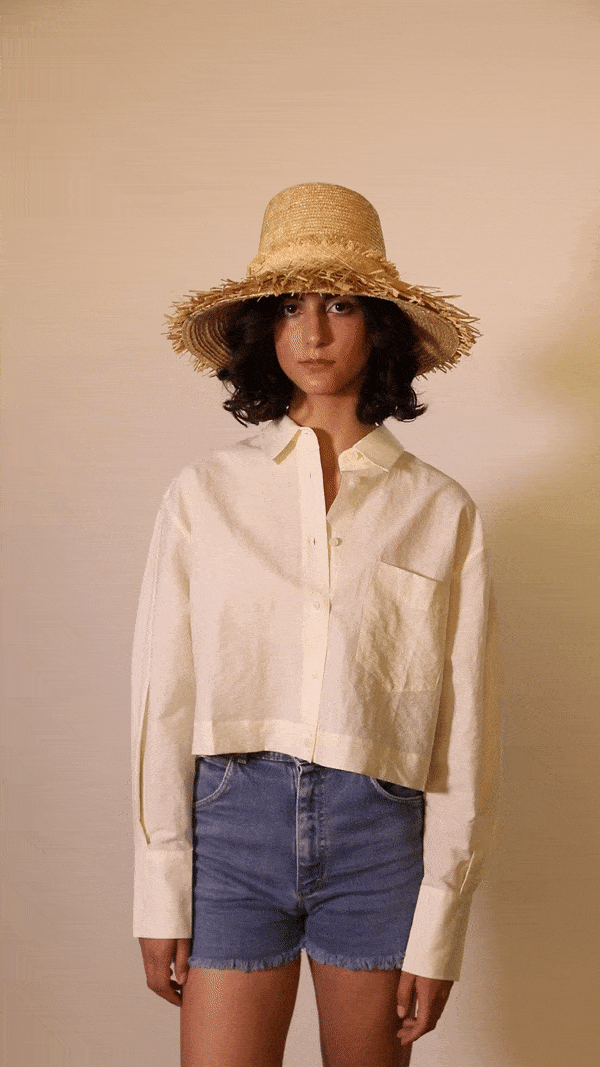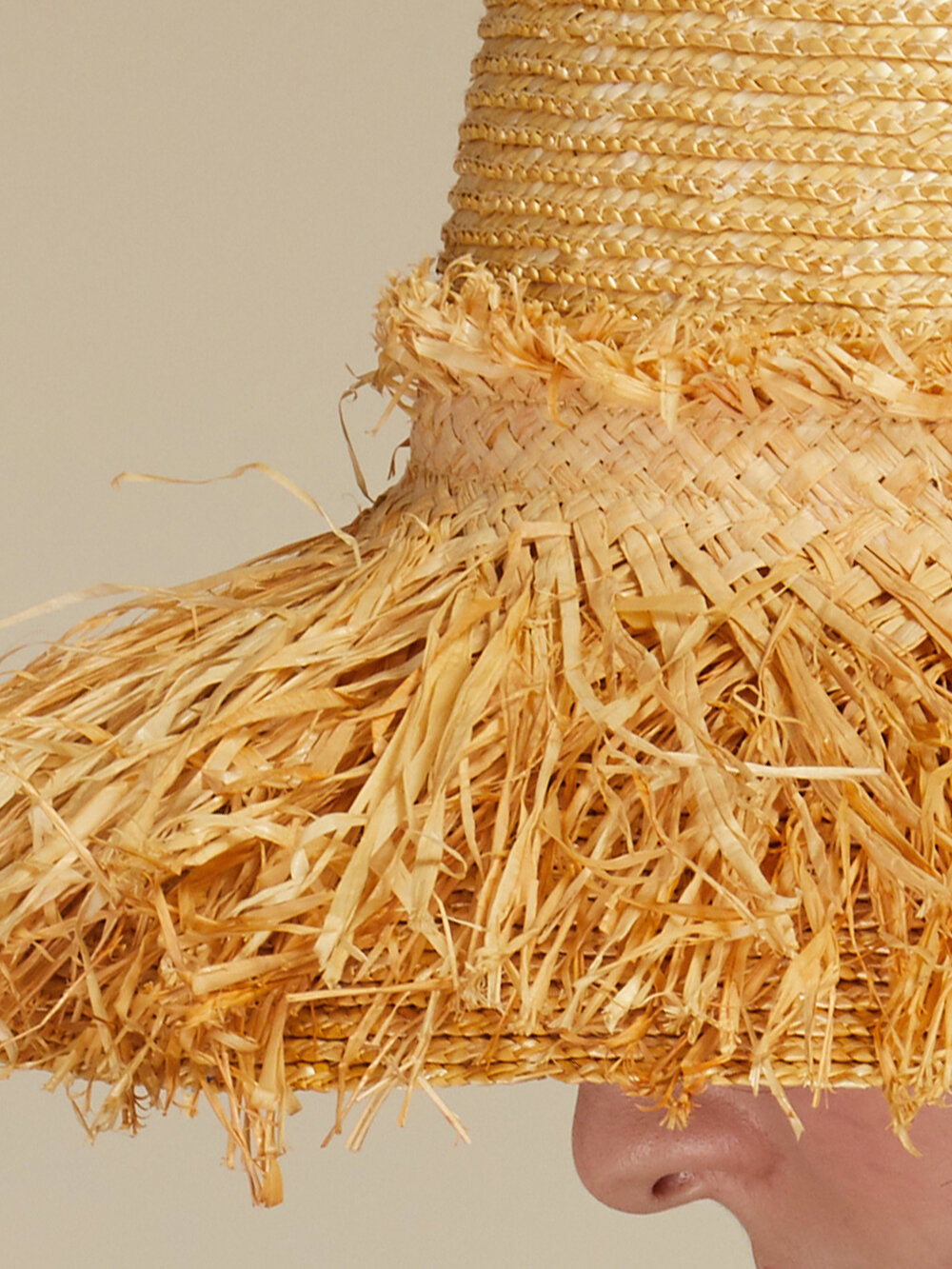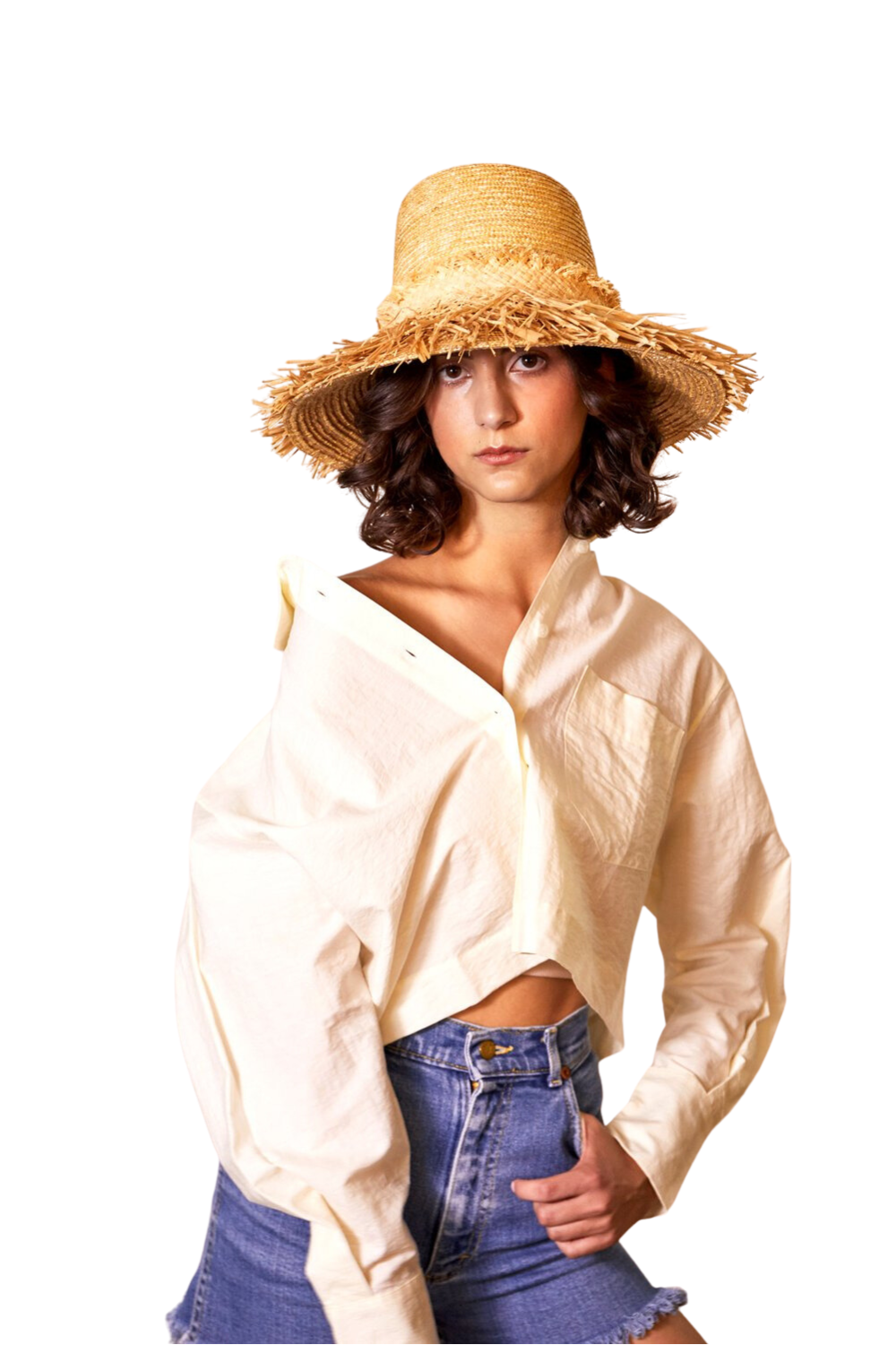 Nonchalant and super-cool, this wheat straw hat combines a modern silhouette with a frisson of the exotic. A skirting of fringed raffia graces the brim to create a fun and flirty look that will immediately transport you to your dream destination.