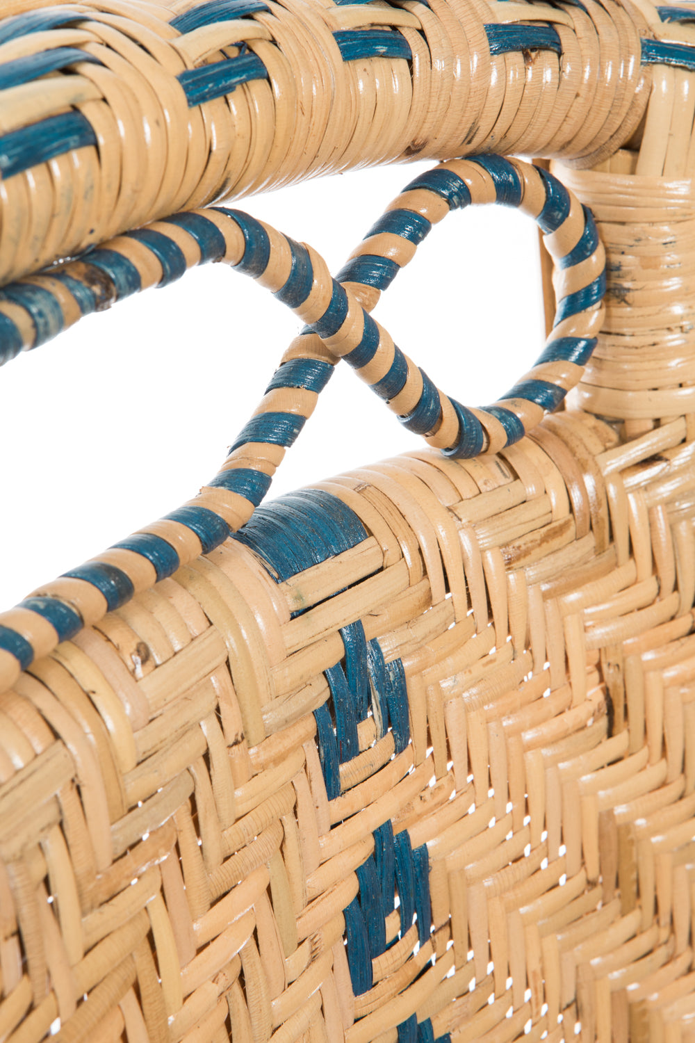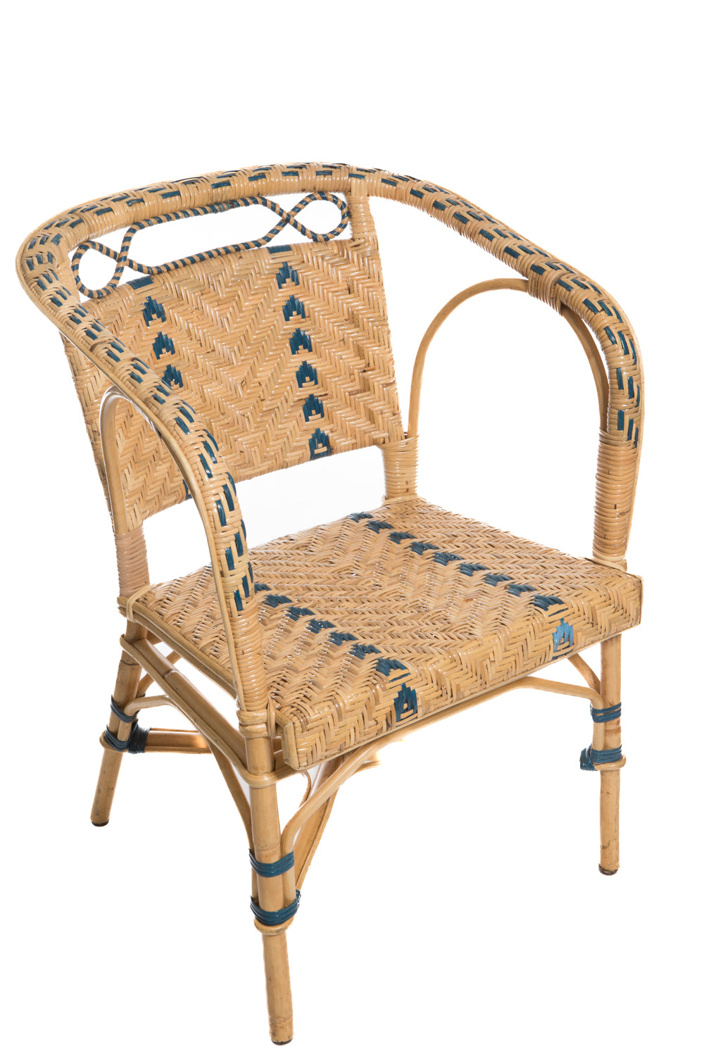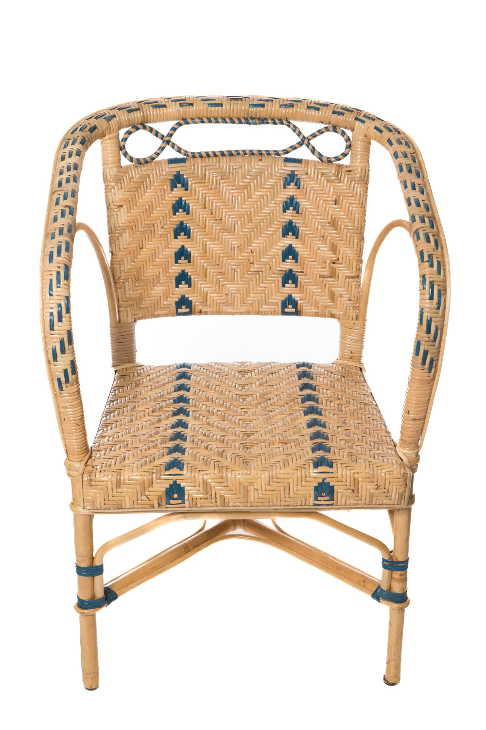 Handwoven in Morocco by a renowned rattan atelier, this striking chair features bold accents in Majorelle blue—a tribute to the iconic gardens of Marrakech.