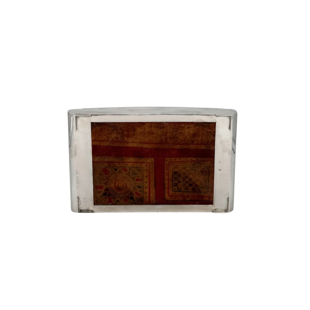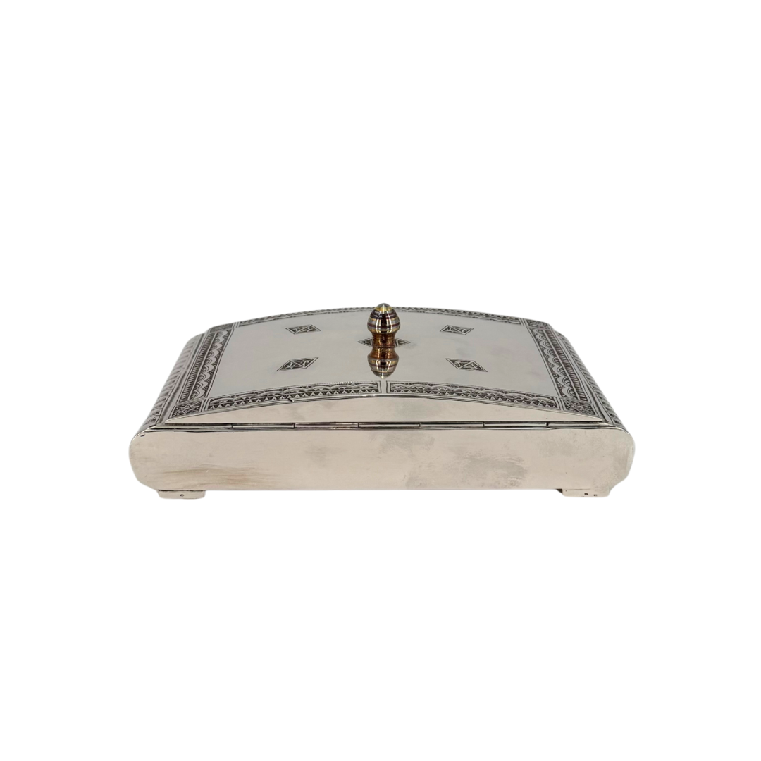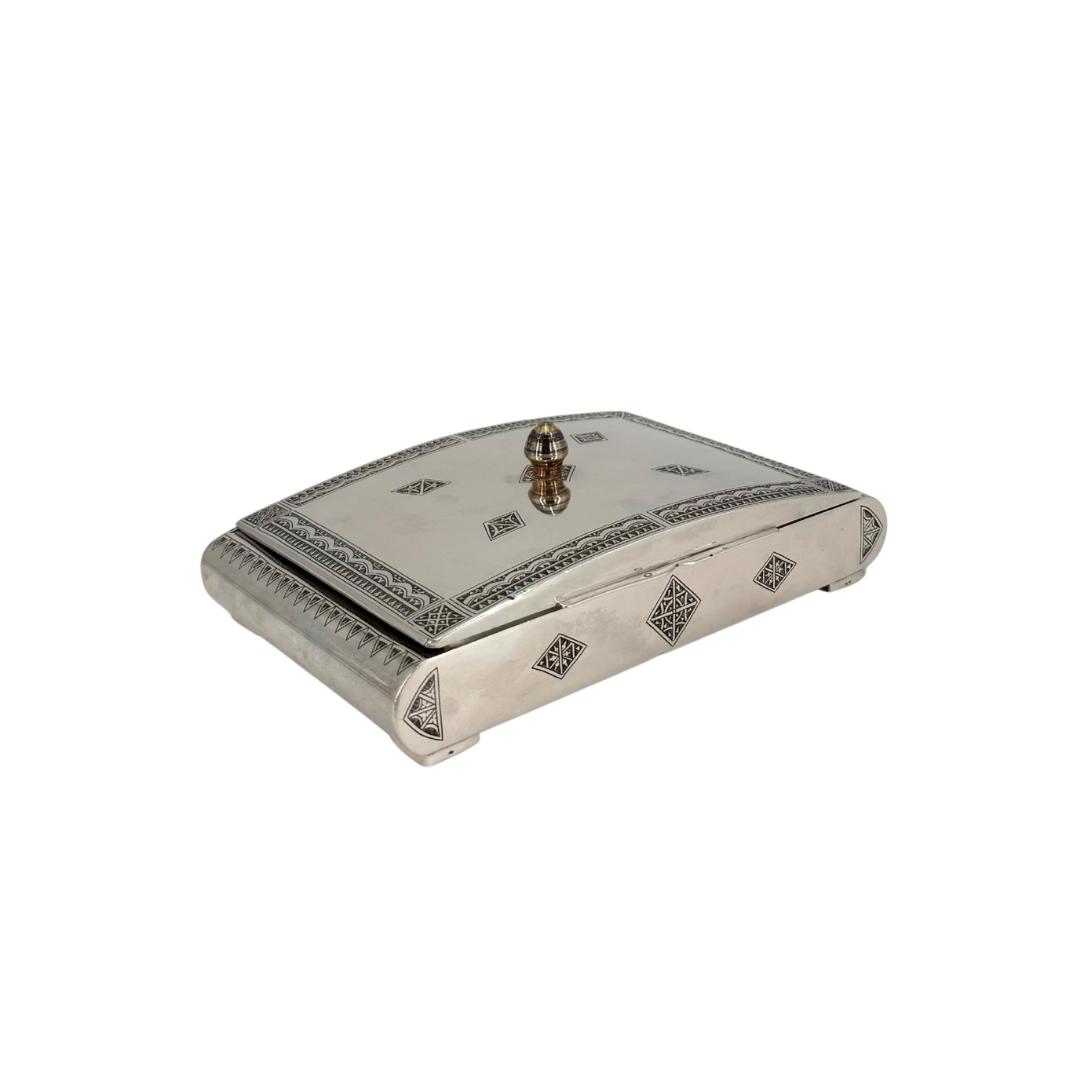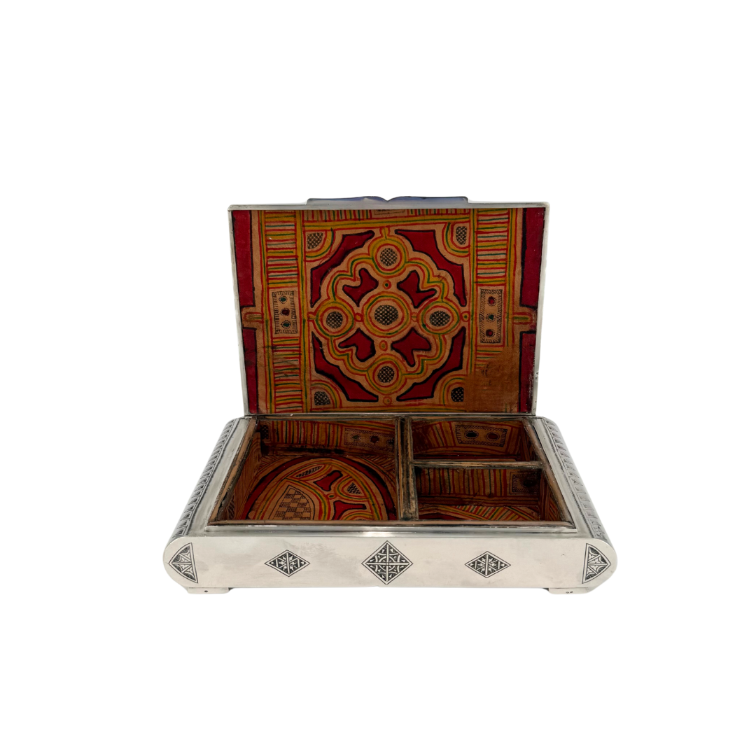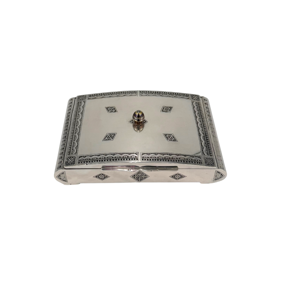 Hand-engraved in the Sahara, this silver box features intricate detailing and a striking graphic leather interior. A beautiful 1920s piece for storing jewelry or treasured keepsakes.