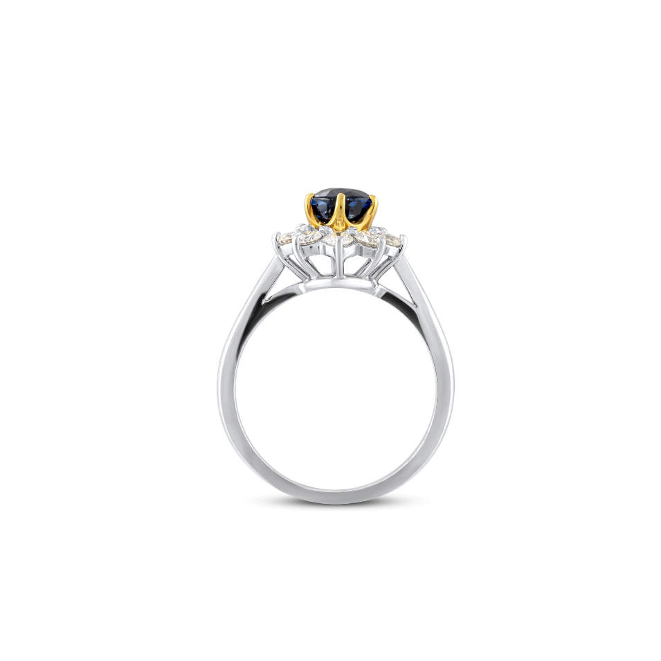 Notes: A deep blue oval sapphire surrounded by a halo of round brilliant diamonds.