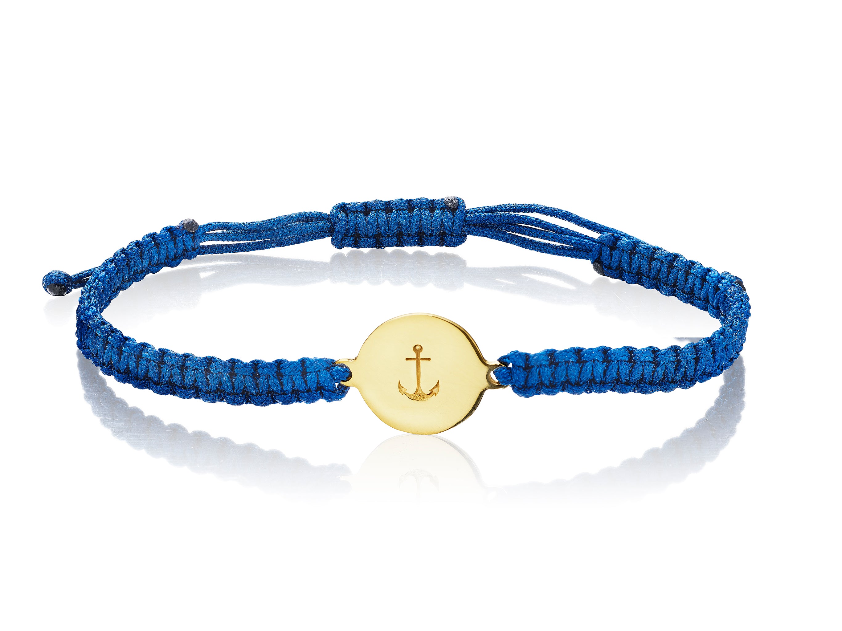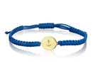 The anchor represents stability, hope and safe travels. This bracelet by famed jeweler Elena Votsi features an anchor beautifully engraved into solid 18K gold with a blue silk band.