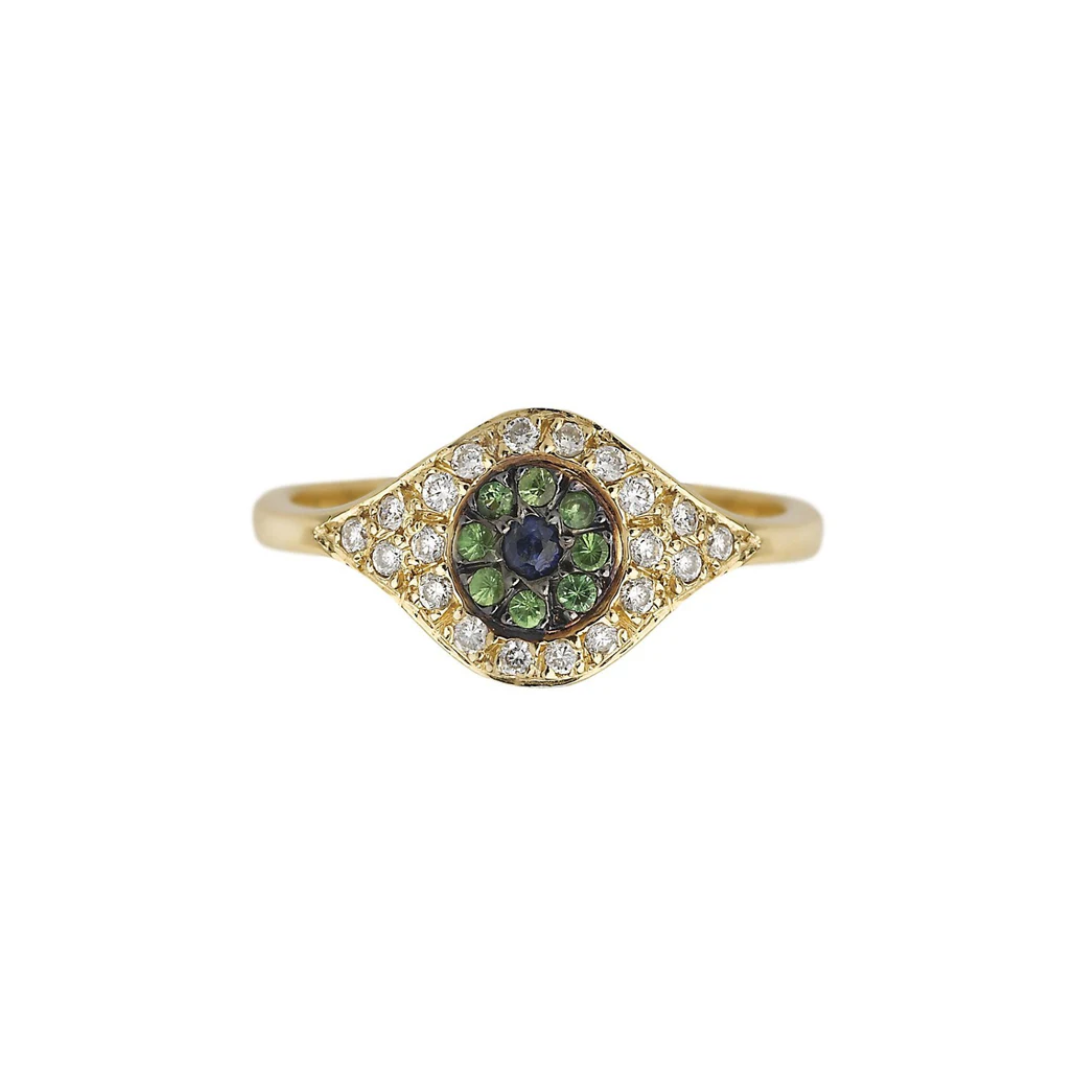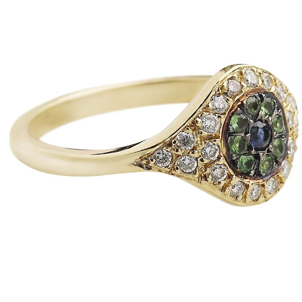 Handmade from 18-karat yellow gold, this 'Cats Eye' ring is set with 0.33 carats of white diamonds, tsavorites and blue sapphire centre.