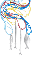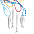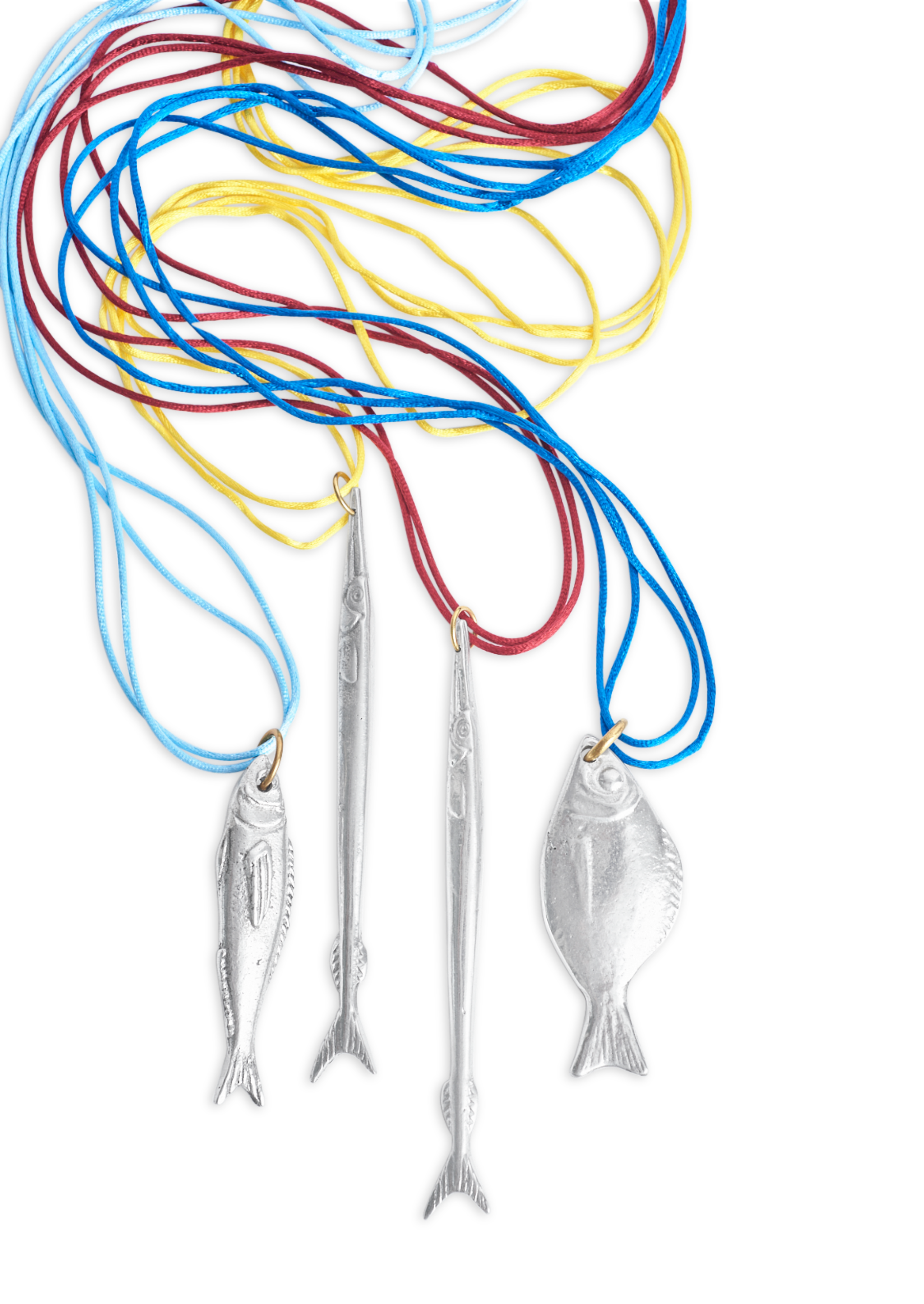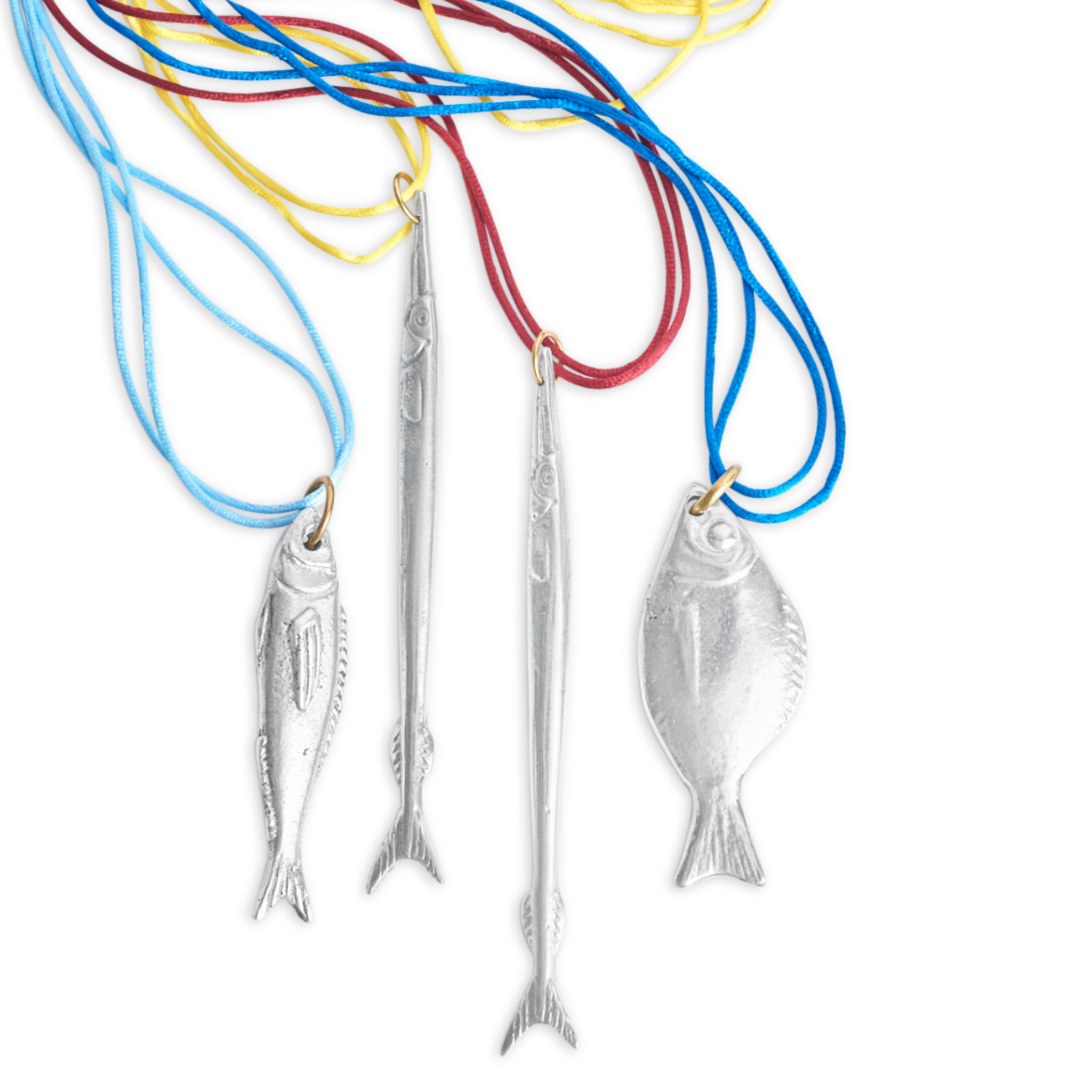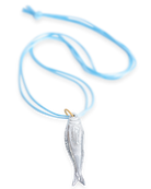 Inspired by the fish of the Aegean sea, this pendant makes a bold statement! The realistic, shimmering fish hangs from a double silk cord.